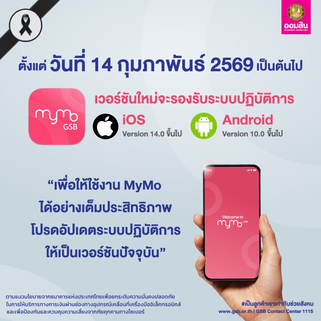 ธนาคารออมสิน แจ้งเตือนผู้ใช้งาน MyMo อัปเดตระบบปฏิบัติการก่อนใช้งานเวอร์ชันใหม่ เริ่ม 14 ก.พ. 69