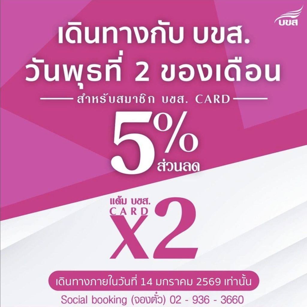 บขส. จัดโปรพิเศษเฉพาะวันที่ 2 ของเดือน ม.ค. 69 ซื้อตั๋วลดทันที 5% พร้อมรับแต้มคูณ 2