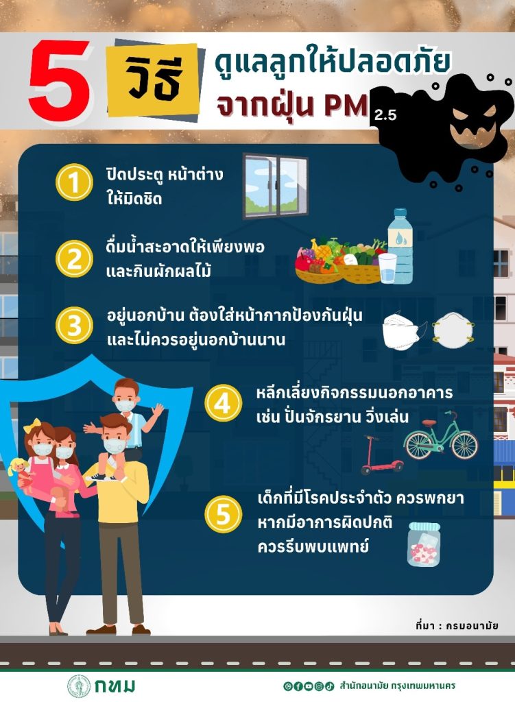 สำนักอนามัย กรุงเทพมหานคร แนะนำ 5 วิธี ดูแลลูกให้ปลอดภัยจากฝุ่น PM 2.5 ดังนี้