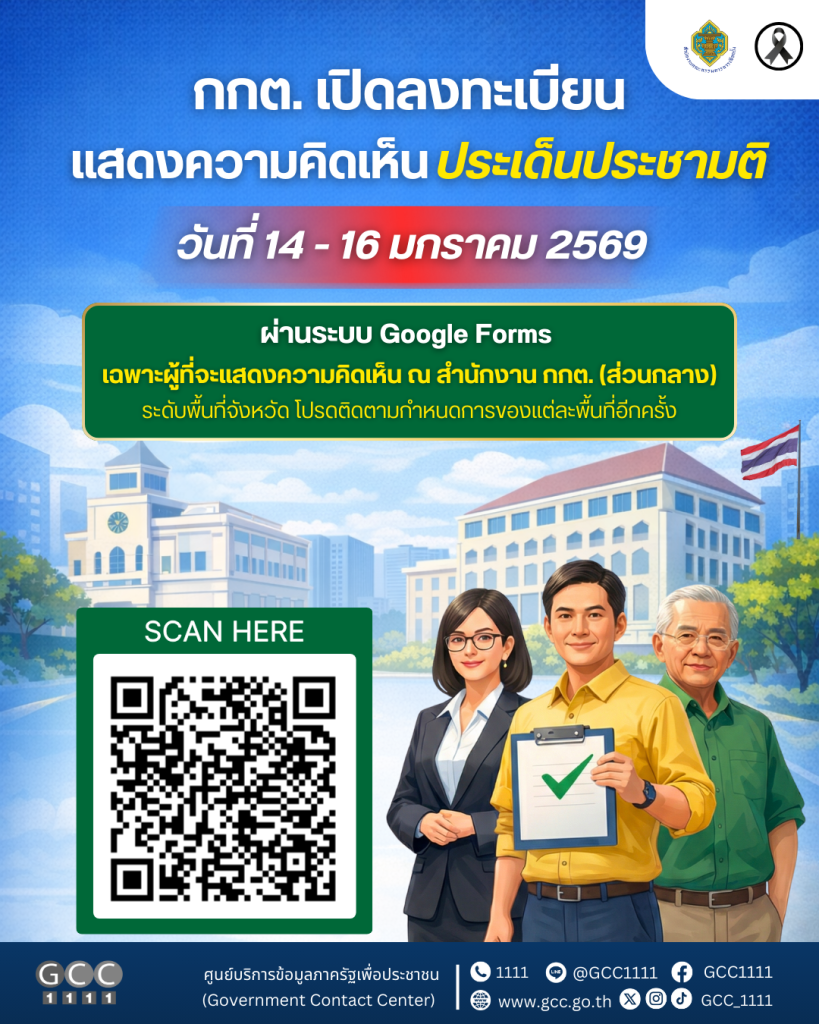 กกต. เปิดลงทะเบียนแสดงความคิดเห็นประเด็นประชามติ วันที่ 14 – 16 ม.ค. 69 ข่าวสารกิจกรรม กกต. เปิดลงทะเบียนแสดงความคิดเห็นประเด็นประชามติ วันที่ 14 – 16 ม.ค. 69 สำนักงานคณะกรรมการการเลือกตั้ง เปิดให้ประชาชน พรรคการเมือง องค์กรเอกชน และกลุ่มต่าง ๆ ในสังคม ลงทะเบียนแสดงความคิดเห็นเกี่ยวกับประเด็นที่จะจัดให้มีการออกเสียงประชามติ ระหว่างวันที่ 14 – 16 มกราคม 2569 สำนักงานคณะกรรมการการเลือกตั้ง (กกต.) เปิดให้ผู้ประสงค์จะแสดงความคิดเห็นเกี่ยวกับประเด็นที่จะจัดให้มีการออกเสียงประชามติ ลงทะเบียนเข้าร่วมแสดงความคิดเห็น ระหว่างวันที่ 14 – 16 มกราคม 2569 การลงทะเบียนดังกล่าวเปิดสำหรับประชาชน พรรคการเมือง องค์กรเอกชน และกลุ่มต่าง ๆ ในสังคม โดยสามารถลงทะเบียนผ่านระบบ Google Forms ทั้งนี้ เฉพาะผู้ที่ประสงค์จะแสดงความคิดเห็น ณ สำนักงานคณะกรรมการการเลือกตั้ง (ส่วนกลาง) เท่านั้น สำหรับผู้ที่ประสงค์จะแสดงความคิดเห็นในพื้นที่แต่ละจังหวัด ขอให้ติดตามกำหนดการและรายละเอียดการลงทะเบียนจากสำนักงานคณะกรรมการการเลือกตั้งประจำจังหวัด และสำนักงานคณะกรรมการการเลือกตั้งประจำกรุงเทพมหานครต่อไป ที่มา : Facebook กองทุนเพื่อการพัฒนาพรรคการเมือง Post Views: 30 FacebookFacebookXTwitterLINELine
