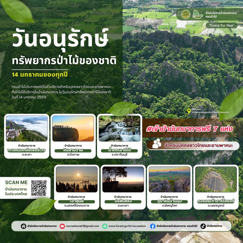 กรมป่าไม้ ประกาศยกเว้นค่าบริการสำหรับบุคคลชาวไทยและยานพาหนะที่เข้าไปใช้บริการในป่านันทนาการ ในวันที่ 14 มกราคม 2569 เนื่องในวันอนุรักษ์ทรัพยากรป่าไม้ของชาติ