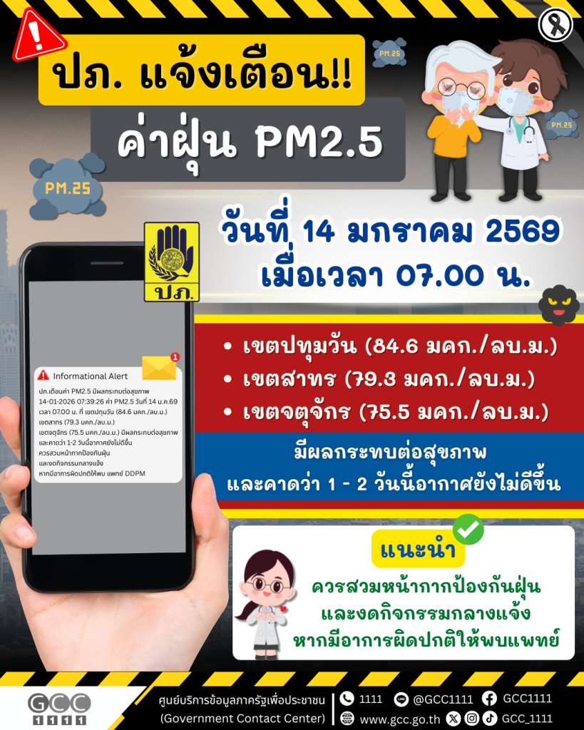 ปภ. แจ้งเตือนค่า PM2.5 วันที่ 14 ม.ค. 69 มีผลกระทบต่อสุขภาพในพื้นที่ เขตปทุมวัน,เขตสาทรและเขตจตุจักร ข่าวสารกิจกรรม, ไม่มีหมวดหมู่ ปภ. แจ้งเตือนค่า PM2.5 วันที่ 14 ม.ค. 69 มีผลกระทบต่อสุขภาพในพื้นที่ เขตปทุมวัน,เขตสาทรและเขตจตุจักร กรมป้องกันและบรรเทาสาธารณภัย (ปภ.) แจ้งเตือนค่าฝุ่น PM2.5 วันที่ 14 มกราคม 2569 เวลา 07.00 น.เขตปทุมวัน (84.6 มคก./ลบ.ม.)เขตสาทร (79.3 มคก./ลบ.ม.)เขตจตุจักร (75.5 มคก./ลบ.ม.) มีผลกระทบต่อสุขภาพ และคาดว่า 1 – 2 วันนี้อากาศยังไม่ดีขึ้น ควรสวมหน้ากากป้องกันฝุ่น และงดกิจกรรมกลางแจ้ง หากมีอาการผิดปกติให้พบแพทย์ กรมป้องกันและบรรเทาสาธารณภัย (ปภ.) แจ้งเตือนค่า PM2.5 วันที่ 14 ม.ค.69 เวลา 07.00 น.เขตปทุมวัน (84.6 มคก./ลบ.ม.)เขตสาทร (79.3 มคก./ลบ.ม.)เขตจตุจักร (75.5 มคก./ลบ.ม.)มีผลกระทบต่อสุขภาพ และคาดว่า 1-2 วันนี้อากาศยังไม่ดีขึ้น ควรสวมหน้ากากป้องกันฝุ่น และงดกิจกรรมกลางแจ้ง หากมีอาการผิดปกติให้พบแพทย์ ปภ. จึงได้ร่วมกับผู้ให้บริการเครือข่ายโทรศัพท์เคลื่อนที่ AIS True และ NT ส่งข้อความแจ้งเตือนผ่าน Cell Broadcast แจ้งเตือนค่า PM2.5 มีผลกระทบต่อสุขภาพ เขตปทุมวัน เขตสาทร เขตจตุจักร กรุงเทพมหานคร ทั้งนี้ สามารถแจ้งเหตุและขอความช่วยเหลือได้ทางไลน์ “ปภ.รับแจ้งเหตุ 1784” เพิ่มเพื่อนที่ Line ID @1784DDPM หรือโทรสายด่วนนิรภัย (ปภ.) 1784 ตลอด 24 ชั่วโมง ที่มา : Facebook กรมป้องกันและบรรเทาสาธารณภัย DDPM Post Views: 35 FacebookFacebookXTwitterLINELine