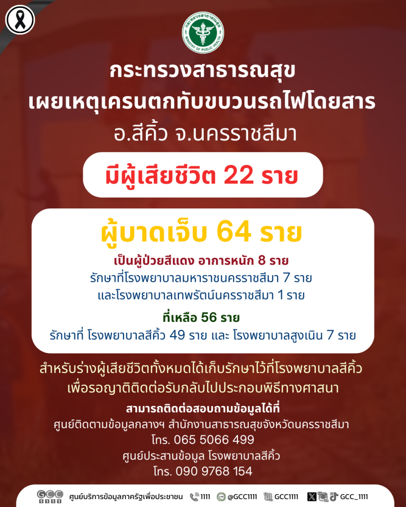 กระทรวงสาธารณสุข เผยเหตุโครงสร้างสะพานรถไฟความเร็วสูงตกทับขบวนรถไฟโดยสาร ณ บ้านถนนคต อำเภอสีคิ้ว จังหวัดนครราชสีมา