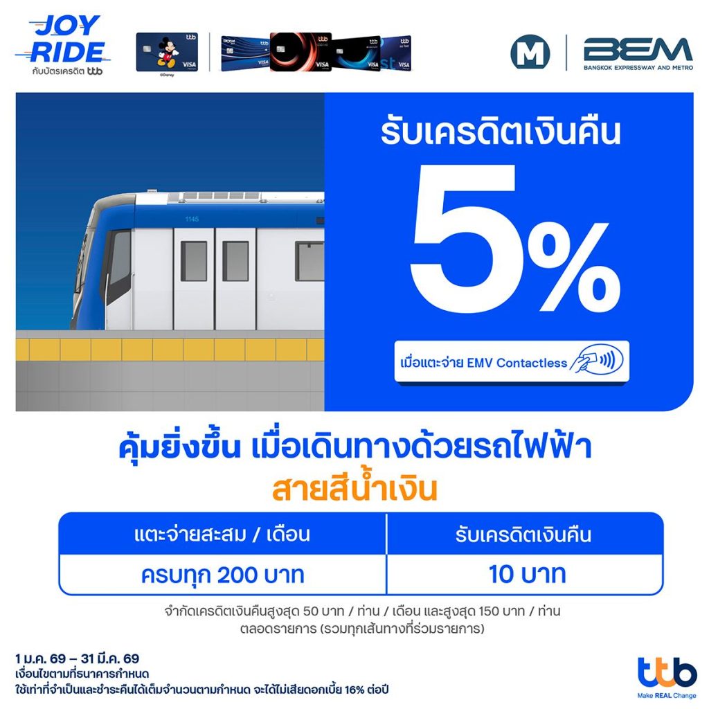 บริษัท ทางด่วนและรถไฟฟ้ากรุงเทพ จำกัด (มหาชน) แนะนำเดินทางด้วยรถไฟฟ้าสายสีน้ำเงิน แตะจ่ายผ่านบัตรเครดิต ttb ทุกประเภท 200 บาท/เดือน รับเครดิตเงินคืน 5% ลงทะเบียนรับสิทธิ์ผ่านแอปพลิเคชัน ttb touch ลงทะเบียนครั้งเดียวรับสิทธิ์ตลอดรายการ และบัตรเครดิต ttb reserve infinite เข้าร่วมรายการได้โดยไม่ต้องลงทะเบียน ตั้งแต่บัดนี้ – 31 มีนาคม 2569