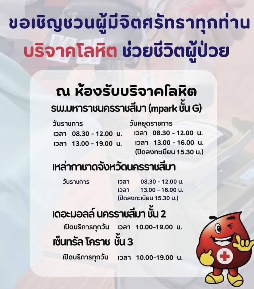 ขอเชิญร่วมบริจาคโลหิตเพื่อช่วยชีวิตผู้ป่วย ผู้บาดเจ็บ เหตุการณ์เครนตกใส่รถไฟ บ้านถนนคต อ.สีคิ้ว จ.นครราชสีมา ข่าวสารกิจกรรม, สาธารณภัย ขอเชิญร่วมบริจาคโลหิตเพื่อช่วยชีวิตผู้ป่วย ผู้บาดเจ็บ เหตุการณ์เครนตกใส่รถไฟ บ้านถนนคต อ.สีคิ้ว จ.นครราชสีมา ขอเชิญร่วมบริจาคโลหิตเพื่อช่วยชีวิตผู้ป่วย ผู้บาดเจ็บ เหตุการณ์เครนตกใส่รถไฟ บ้านถนนคต อ.สีคิ้ว จ.นครราชสีมาร่วมบริจาคโลหิตได้ที่ห้องรับบริจาคโลหิต รพ.มหาราชนครราชสีมา (mpark ชั้น G)วันราชการเวลา 08.30-12.00 น.เวลา 13.00-19.00 น.วันหยุดราชการเวลา 08.30 – 12.00 น.เวลา 13.00-16.00 น.ปิดลงทะเบียน 15.30 น.เหล่ากาชาดจังหวัดนครราชสีมาวันราชการเวลา 08.30-12.00 น.เวลา 13.00-16.00 น.ปิดลงทะเบียน 15.30 น.เดอะมอลล์ นครราชสีมา ชั้น 2เปิดบริการทุกวัน เวลา 10.00-19.00 น.โทร. 044 231555เซ็นทรัล โคราช ชั้น 3เปิดบริการทุกวัน เวลา 10.00-19.00 น.โทร. 044 229329ชั้นใต้ดิน อาคารเอ็มพาร์ โทร. 044 235915 ที่มา : Facebook กองทัพภาคที่ 2 Post Views: 14 FacebookFacebookXTwitterLINELine