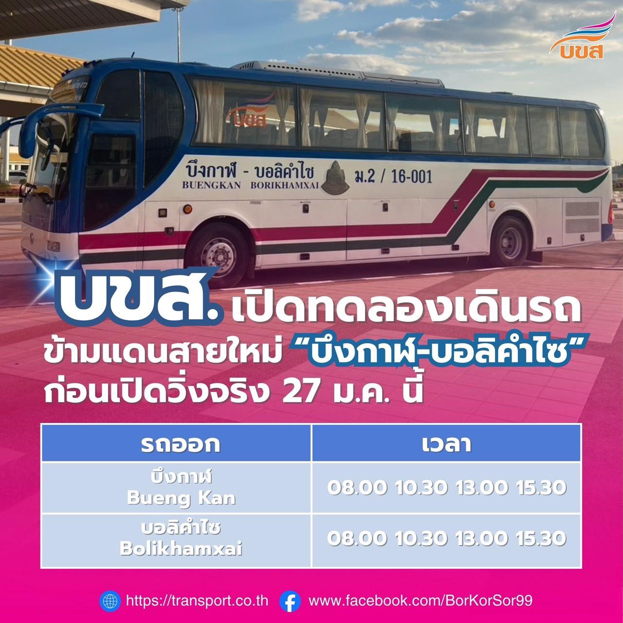 บริษัท ขนส่ง จำกัด เปิดทดลองเดินรถข้ามแดนสายใหม่ “บึงกาฬ – บอลิคำไซ” ก่อนเปิดให้บริการจริง ในวันที่ 27 มกราคม 2569 จองตั๋วได้ตั้งแต่บัดนี้