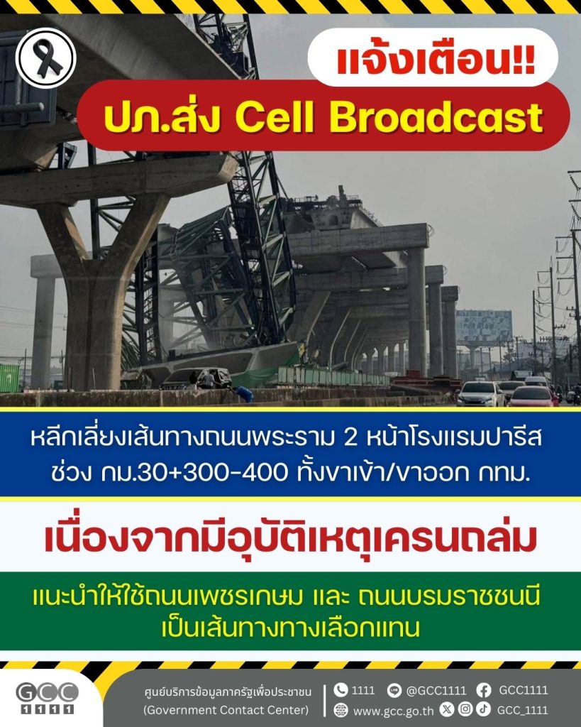 ปภ.ส่ง Cell Broadcast แจ้งเตือนเลี่ยงเส้นทางถนนพระราม 2 เนื่องจากมีอุบัติเหตุเครนถล่ม วันนี้ (15 ม.ค. 69) ข่าวสารกิจกรรม, สาธารณภัย ปภ.ส่ง Cell Broadcast แจ้งเตือนเลี่ยงเส้นทางถนนพระราม 2 เนื่องจากมีอุบัติเหตุเครนถล่ม วันนี้ (15 ม.ค. 69) วันนี้ (15 มกราคม 2569) ปภ.ส่ง Cell Broadcast แจ้งเตือนเลี่ยงเส้นทางถนนพระราม 2 หน้าโรงแรมปารีส ช่วง กม.30+300-400 ทั้งขาเข้า/ขาออก กทม. เนื่องจากมีอุบัติเหตุเครนถล่ แนะนำให้ใช้ ถนนเพชรเกษม และ ถนนบรมราชชนนี แทน ที่มา : Facebook กรมป้องกันและบรรเทาสาธารณภัย DDPM Post Views: 26 FacebookFacebookXTwitterLINELine