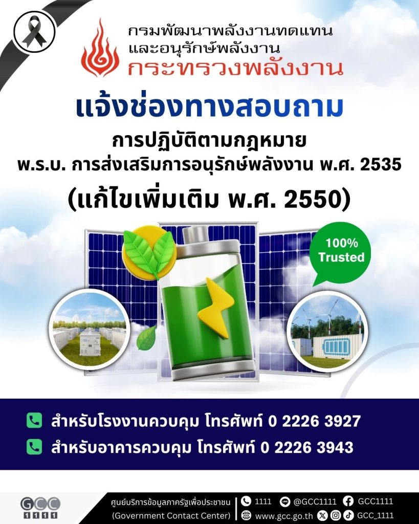 กรมพัฒนาพลังงานทดแทนและอนุรักษ์พลังงาน แจ้งช่องทางสอบถาม การปฏิบัติตามกฎหมาย พ.ร.บ. การส่งเสริมการอนุรักษ์พลังงาน พ.ศ. 2535 (แก้ไขเพิ่มเติม พ.ศ. 2550)