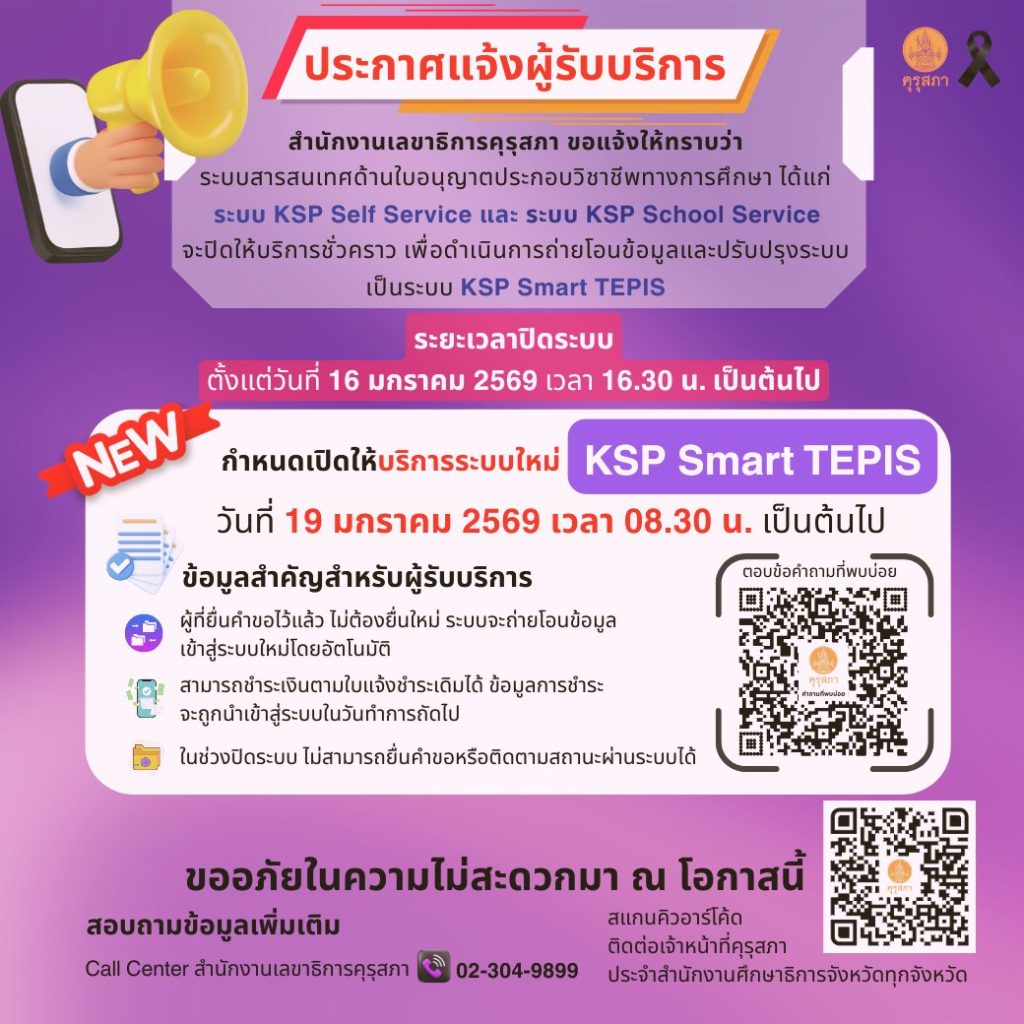 • จะปิดให้บริการชั่วคราว เพื่อดำเนินการถ่ายโอนข้อมูลและปรับปรุงระบบเป็น ระบบ KSP Smart TEPIS