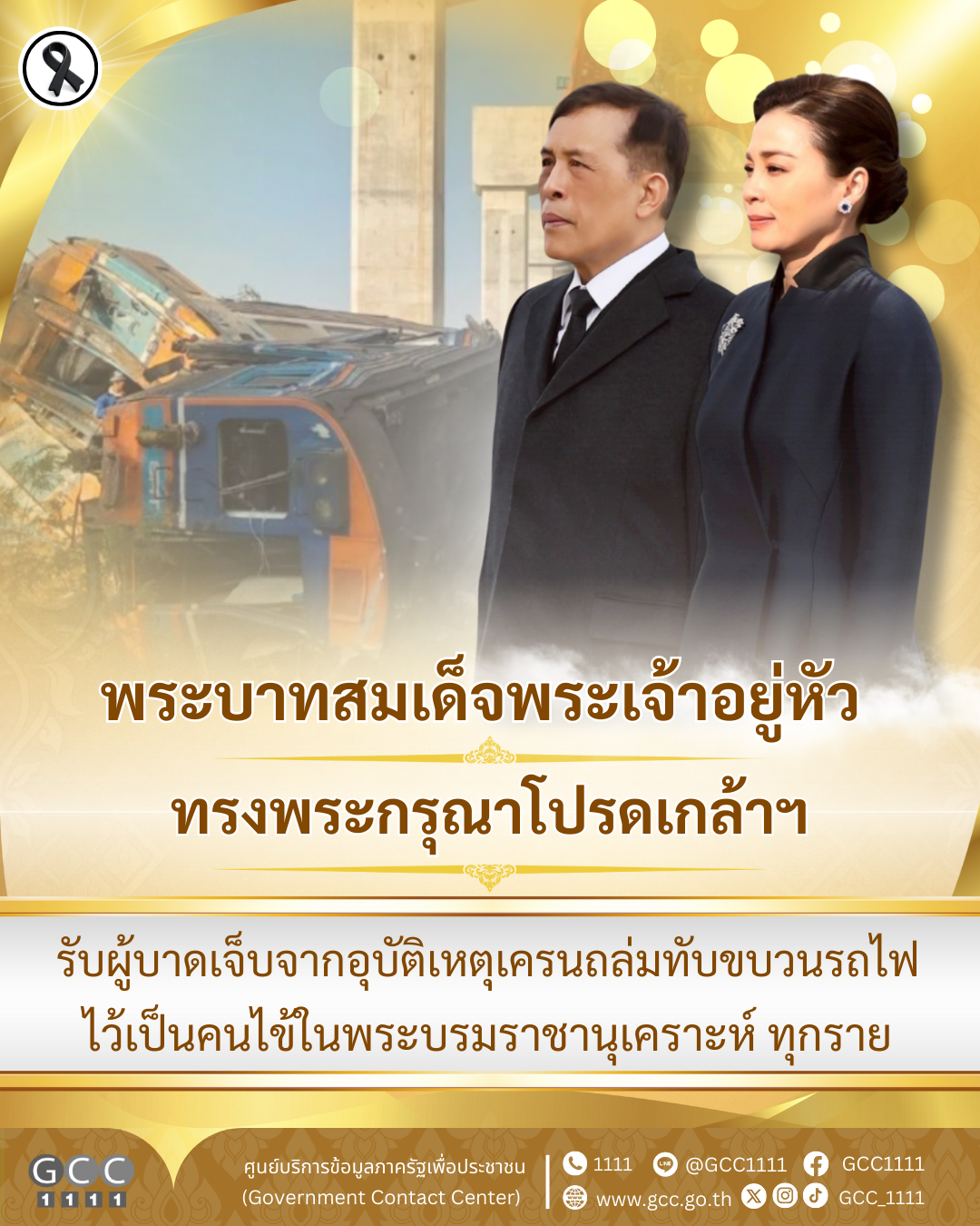 พระบาทสมเด็จพระเจ้าอยู่หัว ทรงพระกรุณาโปรดเกล้าฯ รับผู้บาดเจ็บจากอุบัติเหตุเครนถล่มทับขบวนรถไฟ ไว้เป็น “คนไข้ในพระบรมราชานุเคราะห์” ทุกราย