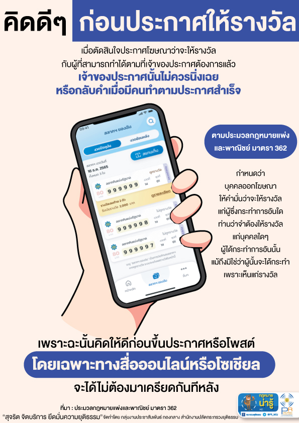 กระทรวงยุติธรรม แนะนำกฎหมายน่ารู้ ตอน คิดดี ๆ ก่อนประกาศให้รางวัล