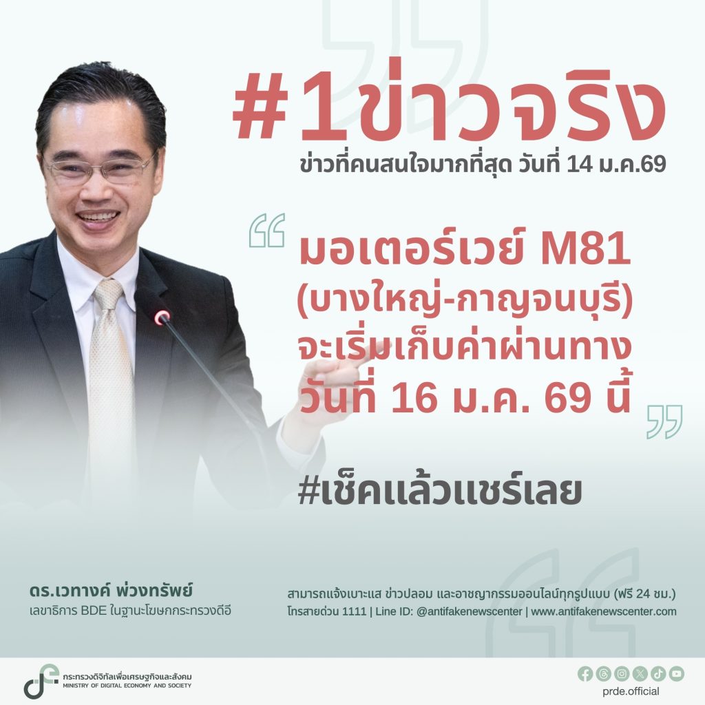 กระทรวงดิจิทัลเพื่อเศรษฐกิจและสังคม แจงข่าวจริง “มอเตอร์เวย์ M81 (บางใหญ่-กาญจนบุรี) เริ่มเก็บค่าผ่านทาง 16 ม.ค. 69” ขอ ปชช. เลือกเชื่อ-แชร์ ข้อมูลทางการเท่านั้น