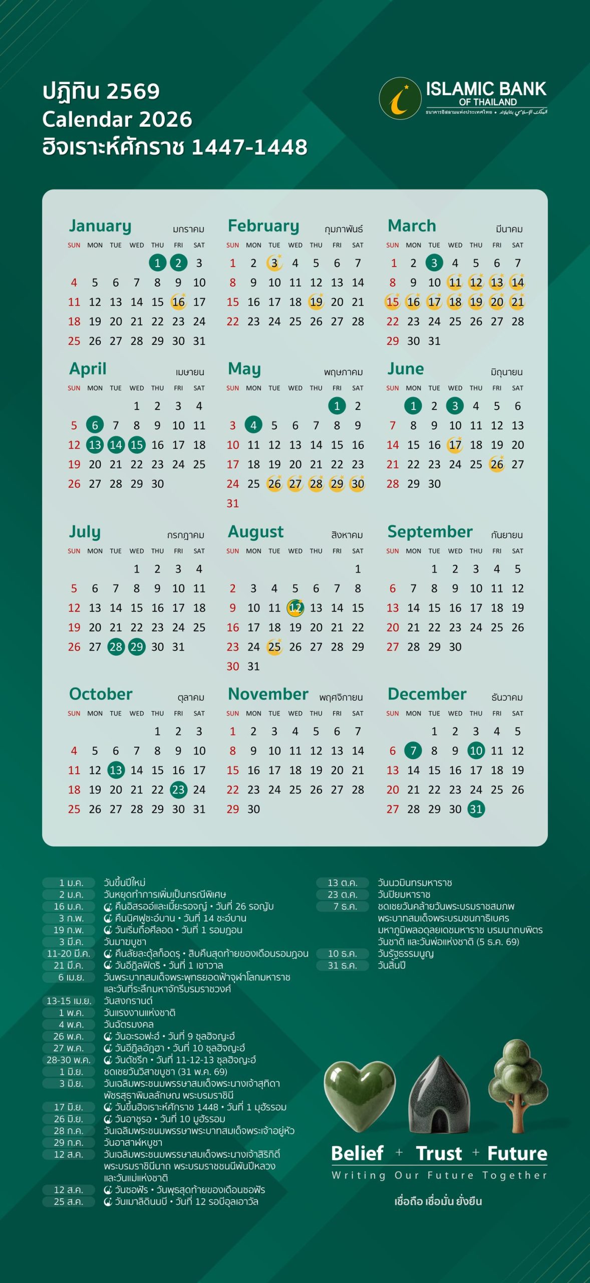 ธนาคารอิสลามแห่งประเทศไทย เชิญชวนดาวน์โหลดฟรี ปฏิทินธนาคารอิสลามแห่งประเทศไทย ปี 2569 รวบรวมวันสำคัญต่างๆ ทั้งวันหยุดราชการ และวันสำคัญของพี่น้องมุสลิม