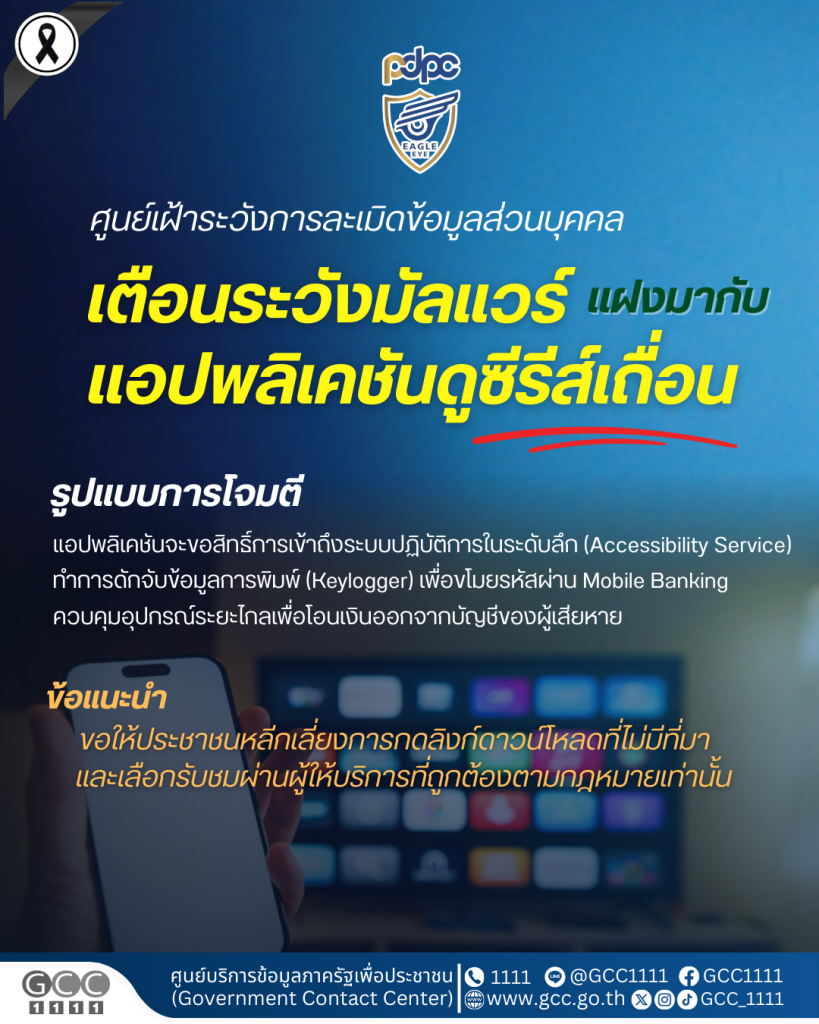 ข้อแนะนำ: เพื่อความปลอดภัยของข้อมูลและทรัพย์สิน ขอให้ประชาชนหลีกเลี่ยงการกดลิงก์ดาวน์โหลดที่ไม่มีที่มา และเลือกรับชมผ่านผู้ให้บริการที่ถูกต้องตามกฎหมายเท่านั้น
