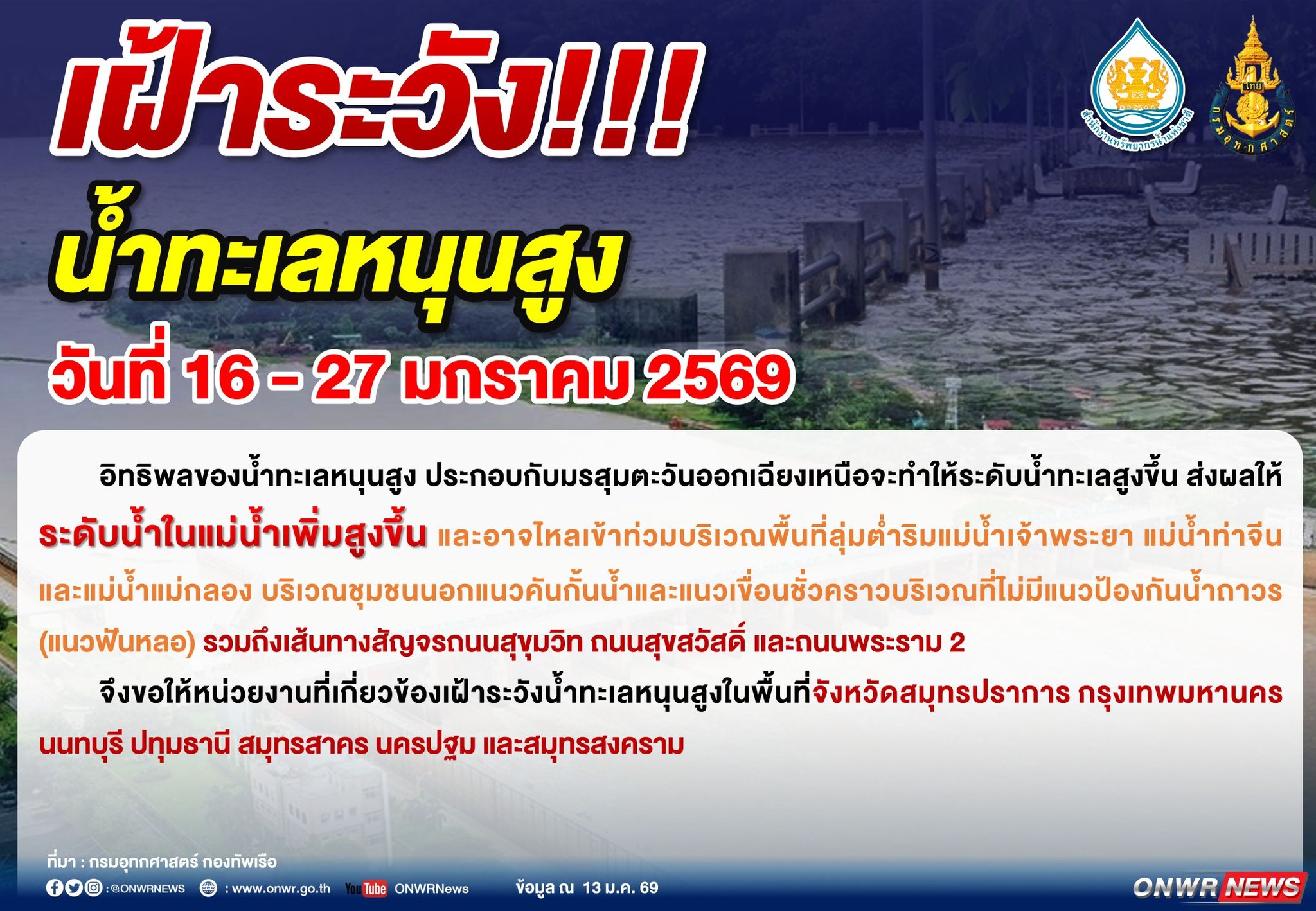 สำนักงานทรัพยากรน้ำแห่งชาติ ประกาศเฝ้าระวังน้ำทะเลหนุนสูง ช่วงวันที่ 16 – 27 มกราคม 2569 ข่าวสารกิจกรรม, สาธารณภัย สำนักงานทรัพยากรน้ำแห่งชาติ ประกาศเฝ้าระวังน้ำทะเลหนุนสูง ช่วงวันที่ 16 – 27 มกราคม 2569 สำนักงานทรัพยากรน้ำแห่งชาติ ประกาศเฝ้าระวังน้ำทะเลหนุนสูง ในช่วงวันที่ 16 – 27 มกราคม 2569 เนื่องจากอิทธิพลของน้ำทะเลหนุนสูง ประกอบกับมรสุมตะวันออกเฉียงเหนือจะทำให้ระดับน้ำทะเลสูงขึ้น สำนักงานทรัพยากรน้ำแห่งชาติ ประกาศเฝ้าระวังน้ำทะเลหนุนสูง วันที่ 16 – 27 มกราคม 2569 อิทธิพลของน้ำทะเลหนุนสูง ประกอบกับมรสุมตะวันออกเฉียงเหนือจะทำให้ระดับน้ำทะเลสูงขึ้น ส่งผลให้ระดับน้ำในแม่น้ำเพิ่มสูงขึ้น และอาจไหลเข้าท่วมบริเวณพื้นที่ลุ่มต่ำริมแม่น้ำเจ้าพระยา แม่น้ำท่าจีน และแม่น้ำแม่กลอง บริเวณชุมชนนอกแนวคันกั้นน้ำและแนวเขื่อนชั่วคราวบริเวณที่ไม่มีแนวป้องกันน้ำถาวร (แนวฟันหลอ) รวมถึงเส้นทางสัญจรถนนสุขุมวิท ถนนสุขสวัสดิ์ และถนนพระราม 2 จึงขอให้หน่วยงานที่เกี่ยวข้องเฝ้าระวังน้ำทะเลหนุนสูงในพื้นที่จังหวัดสมุทรปราการ กรุงเทพมหานคร นนทบุรี ปทุมธานี สมุทรสาคร นครปฐม และสมุทรสงคราม ที่มา : Facebook สำนักงานทรัพยากรน้ำแห่งชาติ Post Views: 22 FacebookFacebookXTwitterLINELine