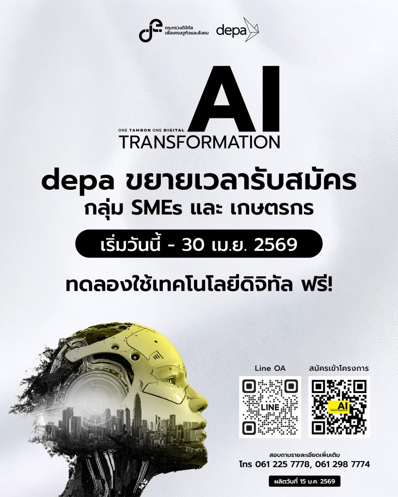สำนักงานส่งเสริมเศรษฐกิจดิจิทัล ขยายเวลารับสมัครโครงการ AI Transformation โอกาสสำหรับผู้ประกอบการและเกษตรกร ยกระดับและเริ่มต้นธุรกิจด้วยเทคโนโลยีดิจิทัล ภายใต้มาตรการส่งเสริมดิจิทัล 2 รูปแบบ d-Voucher และ d-Transform รวมกว่า 15,600 ราย