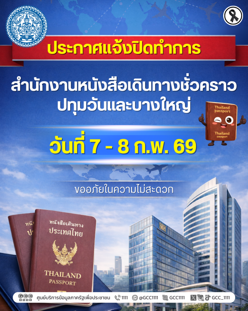 สำนักงานหนังสือเดินทางชั่วคราว ปทุมวัน และบางใหญ่ แจ้งปิดทำการ ในวันที่ 7 – 8 กุมภาพันธ์ 2569