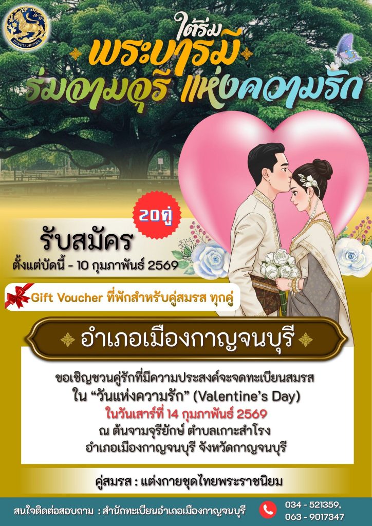 อำเภอเมืองกาญจนบุรี ขอเชิญชวนคู่รักจดทะเบียนสมรส ในวันที่ 14 กุมภาพันธ์ 2569
