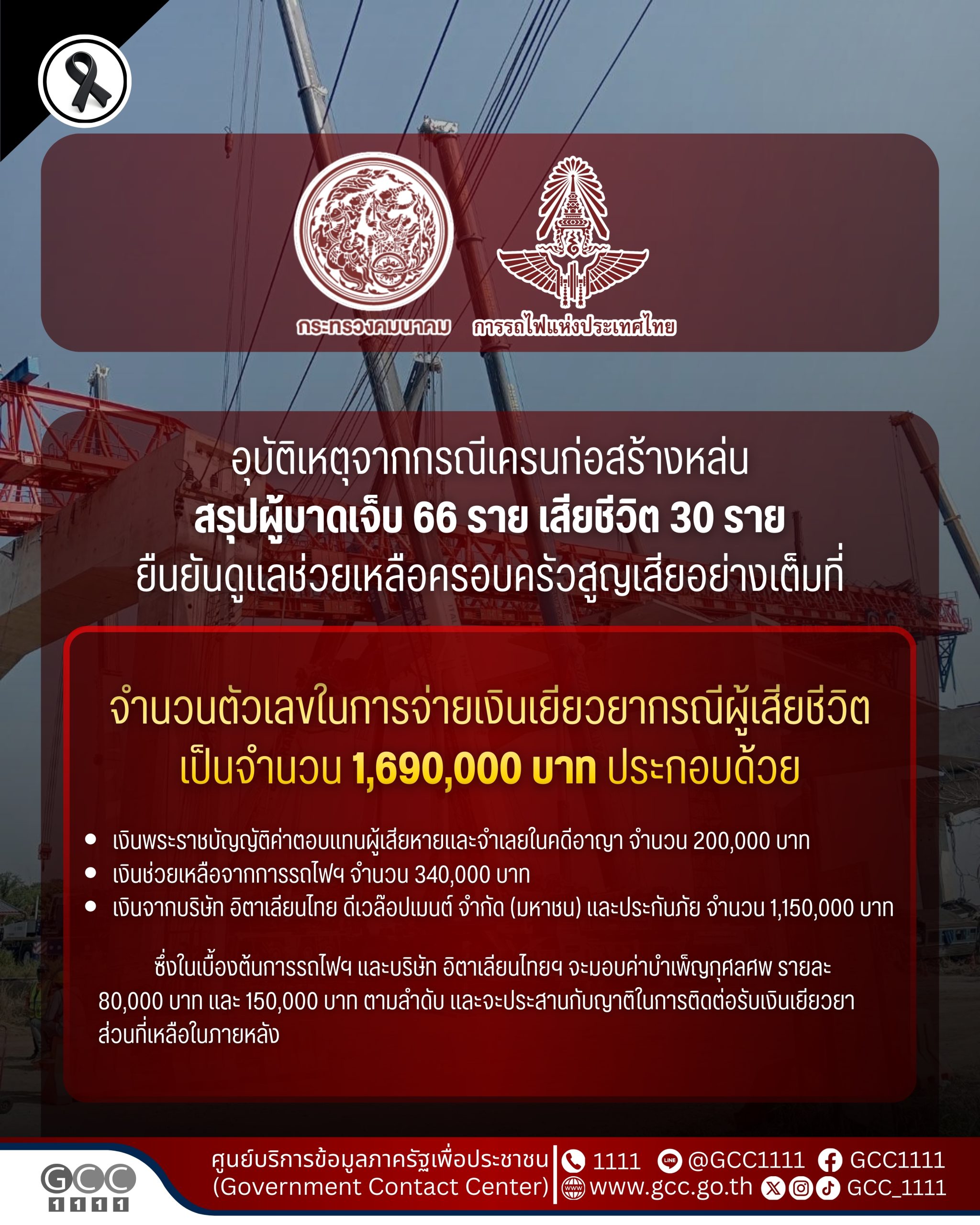 อุบัติเหตุจากกรณีดังกล่าว สามารถสรุปตัวเลขผู้โดยสารที่อยู่บนขบวนรถ ณ จุดเกิดเหตุ เมื่อวันที่ 14 มกราคม 2569 จำนวน 157 คน รถไฟคันที่ 1 จำนวน 54 คน คันที่ 2 จำนวน 53 คน และคันที่ 3 จำนวน 45 คน มีผู้เสียชีวิตทั้งสิ้น 30 ราย เป็นผู้โดยสารรถไฟ 29 ราย พนักงานบริษัท อิตาเลี่ยนไทย จำกัด 1 ราย สามารถยืนยันตัวตนได้แล้ว 29 ราย ส่วนผู้บาดเจ็บมีจำนวน 66 ราย แพทย์อนุญาตให้เดินทางกลับบ้านได้ จำนวน 52 ราย เหลือพักรักษาตัวอยู่โรงพยาบาลอีก 14 ราย