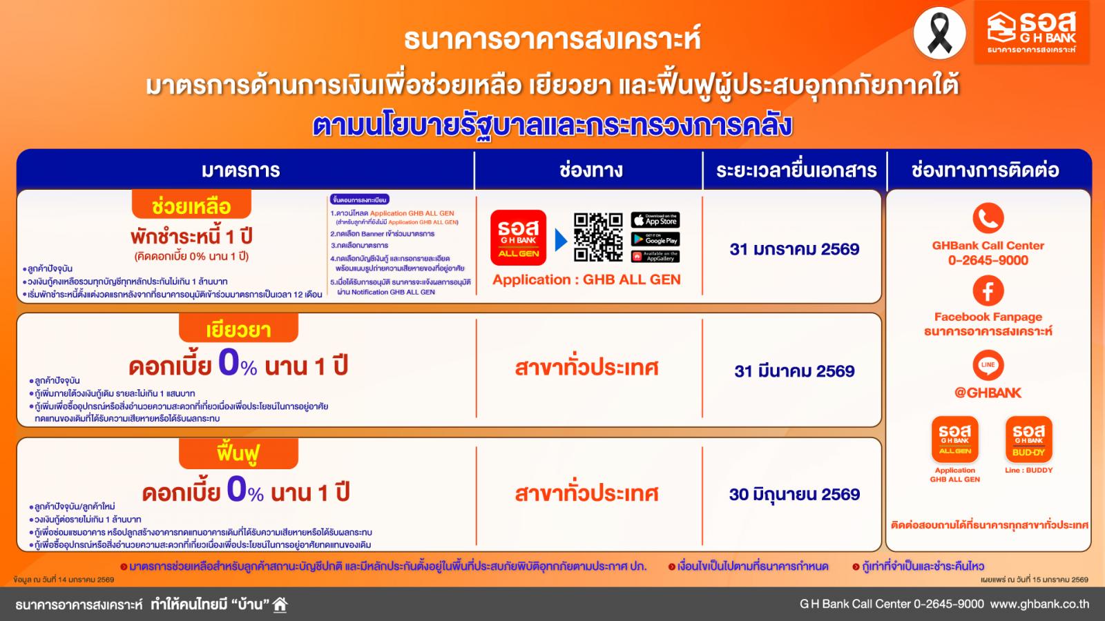 ลูกค้าที่มีความประสงค์เข้าร่วม “มาตรการด้านการเงินเพื่อช่วยเหลือ เยียวยา และฟื้นฟูผู้ประสบอุทกภัยภาคใต้” ในครั้งนี้ ต้องมีสถานะบัญชีปกติ ไม่เป็นหนี้ที่ไม่ก่อให้เกิดรายได้ (NPLs) และมีหลักประกันตั้งอยู่ในพื้นที่ประสบภัยพิบัติอุทกภัยตามประกาศกองอำนวยการกรมป้องกันและบรรเทาสาธารณภัย (ปภ.) ประกอบด้วย 10 จังหวัด 101 อำเภอ 591 ตำบล ได้แก่ ชุมพร นครศรีธรรมราช นราธิวาส ปัตตานี พัทลุง ยะลา ระนอง สงขลา สตูล และสุราษฎร์ธานี สำหรับลูกค้าที่มีความประสงค์เข้าร่วมโครงการช่วยเหลือฯ สามารถกด Banner ใน Application : GHB ALL GEN “มาตรการช่วยเหลือที่อยู่อาศัยที่ได้รับผลกระทบจากอุทกภัยพื้นที่ภาคใต้” บนหน้าจอหลัก เพื่อกรอกข้อมูลส่วนตัวและรายละเอียดความเสียหายของที่อยู่อาศัย พร้อมแนบหลักฐานความเสียหายเพื่อประกอบการพิจารณาให้ความช่วยเหลือ (เงื่อนไขเป็นไปตามที่ธนาคารกำหนด) และธนาคารจะเร่งตรวจสอบข้อมูลและแจ้งผลการพิจารณาอนุมัติเข้าร่วมมาตรการผ่านทางแอปพลิเคชันต่อไป ส่วนลูกค้าที่มีความประสงค์เข้าร่วมโครงการเยียวยาฯ และ โครงการฟื้นฟูฯ สามารถยื่นความประสงค์พร้อมหลักฐานความเสียหายของที่อยู่อาศัยเพื่อประกอบการพิจารณาให้ความช่วยเหลือ ณ สาขาธนาคารทั่วประเทศ สอบถามรายละเอียดเพิ่มเติมได้ที่ G H Bank Call Center โทร. 0 2645 9000 และติดตามข่าวสารของธนาคารได้ที่ G H Bank Social Media ทุกช่องทาง