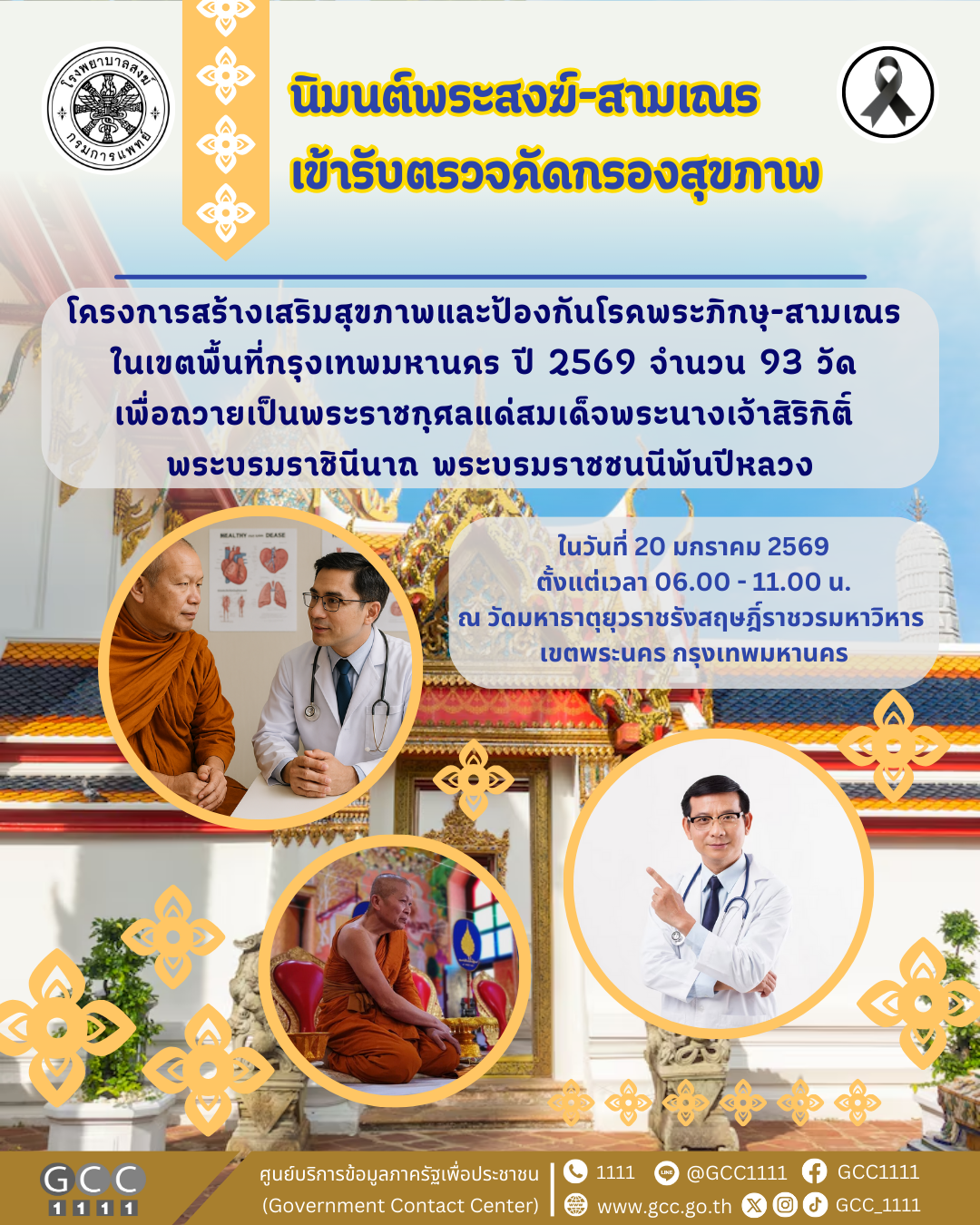 โรงพยาบาลสงฆ์ ร่วมกับหน่วยงานภาคีเครือข่าย ตรวจคัดกรองสุขภาพพระสงฆ์สามเณร ในเขตกรุงเทพมหานคร ประจำปี 2569 เพื่อถวายเป็นพระราชกุศลแด่สมเด็จพระนางเจ้าสิริกิติ์ พระบรมราชินีนาถ พระบรมราชชนนีพันปีหลวง จึงขอนิมนต์พระภิกษุสามเณร เจ้าหน้าที่ของวัดณ วัดมหาธาตุยุวราชรังสฤษฎิ์ราชวรมหาวิหารและวัดใกล้เคียงที่สนใจเข้ารับการตรวจ