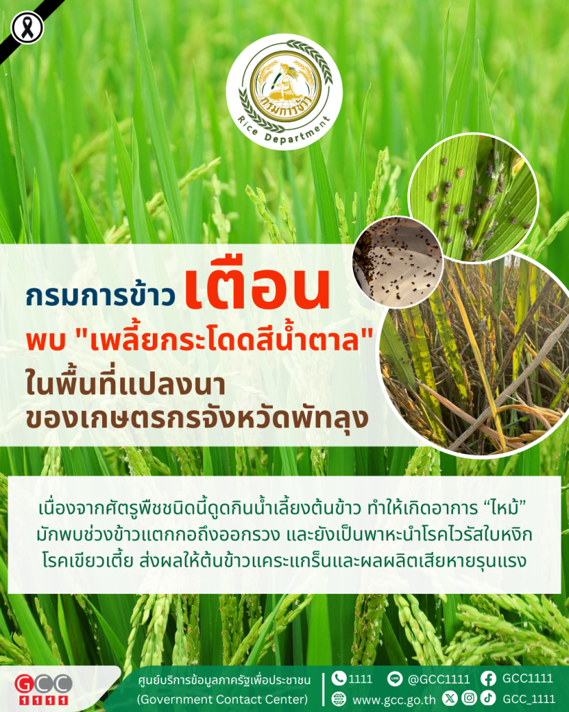 กรมการข้าว เตือน พบ “เพลี้ยกระโดดสีน้ำตาล” ในพื้นที่แปลงนาของเกษตรกรจังหวัดพัทลุง เนื่องจากศัตรูพืชชนิดนี้ดูดกินน้ำเลี้ยงต้นข้าว ทำให้เกิดอาการ “ไหม้” มักพบช่วงข้าวแตกกอถึงออกรวง และยังเป็นพาหะนำโรคไวรัสใบหงิกและโรคเขียวเตี้ย ส่งผลให้ต้นข้าวแคระแกร็นและผลผลิตเสียหายรุนแรง และพร้อมให้คำแนะนำถึงวิธีป้องกันและกำจัดเพลี้ยกระโดดสีน้ำตาลแก่เกษตรกรที่ได้รับผลกระทบอย่างใกล้ชิด