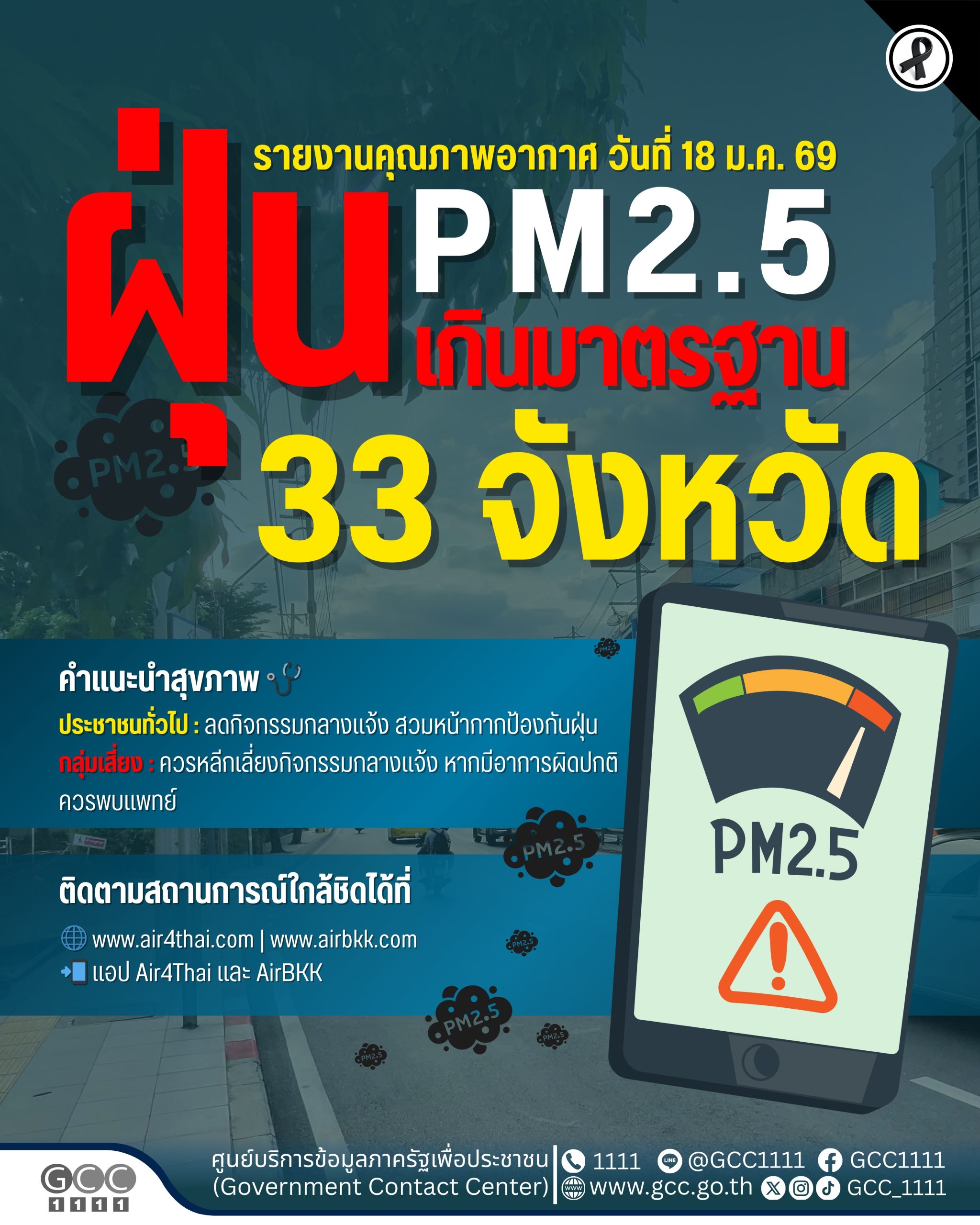 ศูนย์สื่อสารการแก้ไขปัญหามลพิษทางอากาศ รายงานการติดตามตรวจสอบคุณภาพอากาศ ประจำวันที่ 18 มกราคม 2569