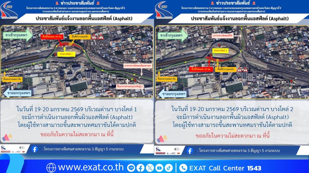 การทางพิเศษแห่งประเทศไทย (กทพ.) ขอแจ้งให้ผู้ใช้ทางทราบว่าในวันที่ 19 – 20 มกราคม 2569 จะมีการดำเนินการขูดผิวถนนแอสฟัลต์ชั้นบนที่เสื่อมสภาพออก เพื่อเตรียมปรับปรุงและปูผิวทางใหม่บริเวณด่านเก็บค่าผ่านทางพิเศษบางโคล่ 1 และด่านฯ บางโคล่ 2 ทางพิเศษเฉลิมมหานคร เพื่อเพิ่มประสิทธิภาพและความปลอดภัยในการใช้งานทางพิเศษ