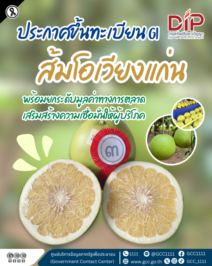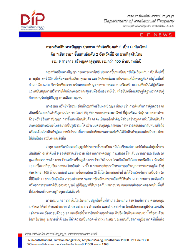 กรมทรัพย์สินทางปัญญา ประกาศขึ้นทะเบียน GI “ส้มโอเวียงแก่น” เป็นอัตลักษณ์เฉพาะถิ่นของผลไม้เศรษฐกิจสำคัญในพื้นที่อำเภอเวียงแก่น จังหวัดเชียงราย พร้อมยกระดับมูลค่าทางการตลาด เสริมสร้างความเชื่อมั่นให้ผู้บริโภค และสนับสนุนการสร้างรายได้แก่เกษตรกรและชุมชนท้องถิ่นอย่างยั่งยืน เพื่อขับเคลื่อนเศรษฐกิจฐานรากควบคู่กับการอนุรักษ์ภูมิปัญญาการผลิตของชุมชน