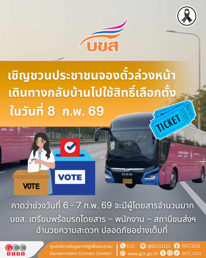 บริษัท ขนส่ง จำกัด เตรียมความพร้อมอำนวยความสะดวกประชาชนเดินทางกลับไปใช้สิทธิ์เลือกตั้งสมาชิกสภาผู้แทนราษฎร ในวันที่ 8 กุมภาพันธ์ 2569 คาดการณ์ว่าผู้โดยสารจะทยอยเดินทางออกจากกรุงเทพฯ ไปยังจังหวัดต่าง ๆ ทั่วทุกภูมิภาค ตั้งแต่วันที่ 6 – 7 กุมภาพันธ์ 2569