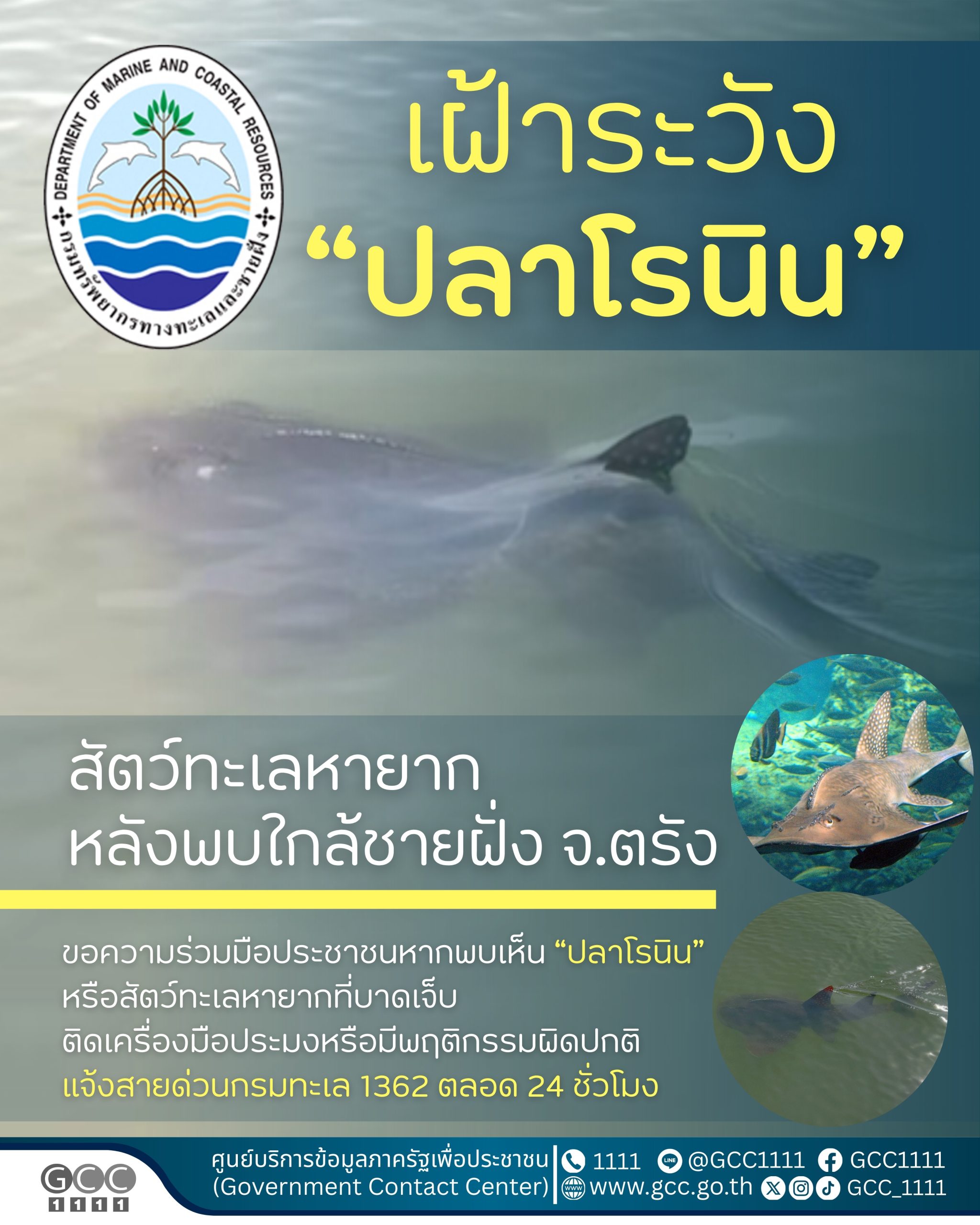 กรมทรัพยากรทางทะเลและชายฝั่ง เฝ้าระวัง “ปลาโรนิน” สัตว์ทะเลหายาก หลังพบใกล้ชายฝั่ง จ.ตรัง