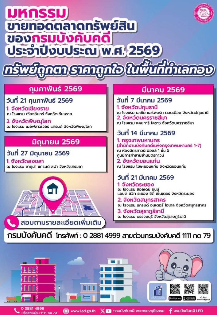 กรมบังคับคดี จัดมหกรรมขายทอดตลาดทรัพย์สิน ในเดือนมกราคม พ.ศ. 2569 สอบถามรายละเอียดเพิ่มเติม กรมบังคับคดี โทร. 0 2881 49999 และสายด่วนกรมบังคับคดี 1111 กด 79