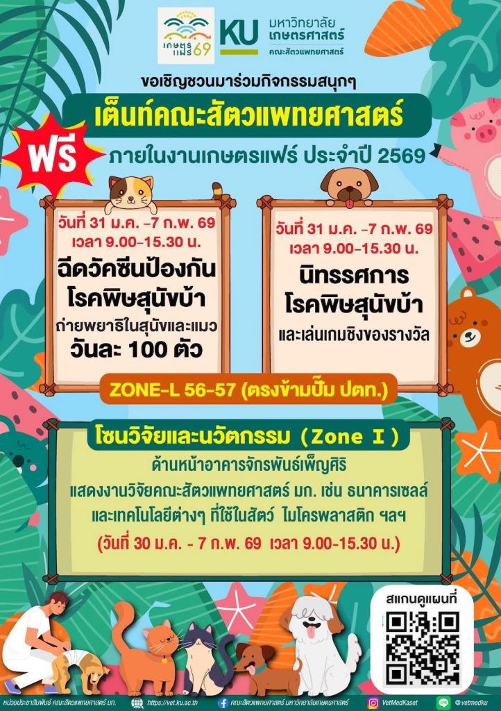 คณะสัตวแพทยศาสตร์ มหาวิทยาลัยเกษตรศาสตร์ เชิญร่วมกิจกรรมภายในงาน เกษตรแฟร์ประจำปี 2569 ฟรี วันที่ 31 มกราคม – 7 กุมภาพันธ์ 2569 เวลา 09.00 – 15.30 น. โซน L 56–L57 ตรงข้ามปั๊ม ปตท. โซน I บริเวณด้านหน้าอาคารจักรพันธ์เพ็ญศิริ