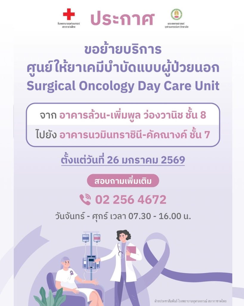 โรงพยาบาลจุฬาลงกรณ์ แจ้งขอย้ายบริการศูนย์ให้ยาเคมีบำบัดแบบผู้ป่วยนอก วันที่ 26 มกราคม 2569 เป็นต้นไป จาก อาคารล้วน-เพิ่มพูล ว่องวานิช ชั้น 8 ไปยัง อาคารนวมินทราชินี-คัคณางค์ ชั้น 7 สอบถามเพิ่มเติม โทร. 02 256 4672 ทุกวันจันทร์ – ศุกร์ เวลา 07.30 – 16.00 น.