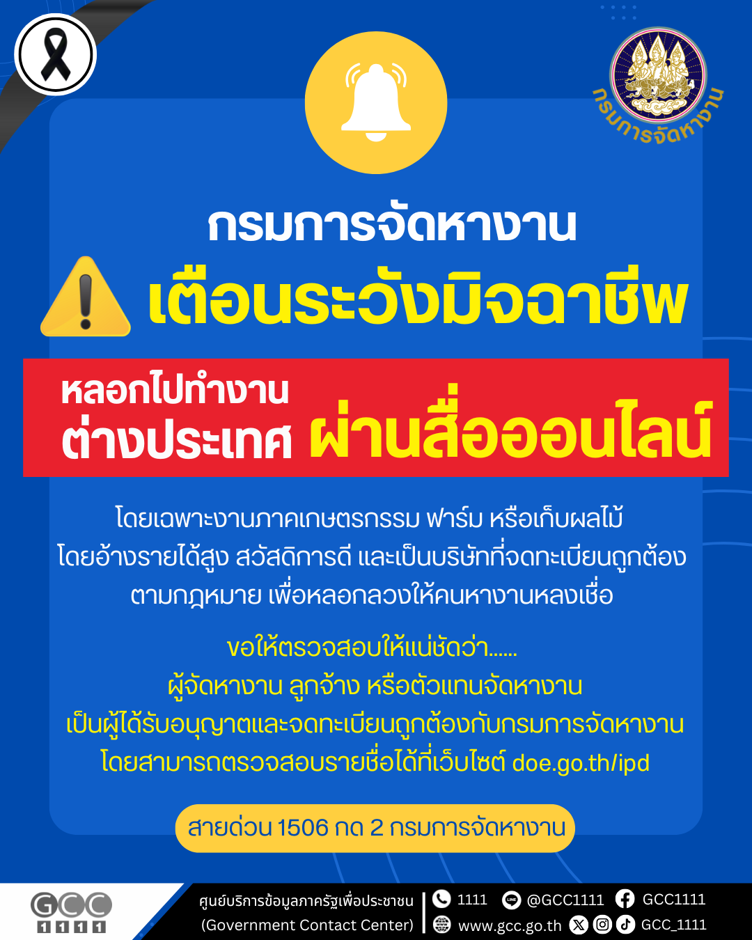 กรมการจัดหางาน แจ้งเตือนระวังมิจฉาชีพหลอกไปทำงานต่างประเทศผ่านสื่อออนไลน์พบว่าปัจจุบันมีกลุ่มมิจฉาชีพใช้สื่อออนไลน์ สร้างเพจปลอม และบัญชีผู้ใช้ปลอมในการโฆษณาชักชวนรับสมัครไปทำงานในต่างประเทศ โดยเฉพาะงานภาคเกษตรกรรม ฟาร์ม หรือเก็บผลไม้ โดยอ้างว่าเป็นงานที่มีรายได้สูง สวัสดิการดี และเป็นบริษัทจัดหางานต่างประเทศที่จดทะเบียนถูกต้องตามกฎหมายกับกรมการจัดหางาน เพื่อหลอกลวงให้คนหางานหลงเชื่อ ขอให้ตรวจสอบให้แน่ชัดว่าเป็นผู้ที่ได้รับอนุญาตจัดหางานให้คนหางานเพื่อไปทำงานในต่างประเทศ ได้จดทะเบียนไว้กับกรมการจัดหางานหรือไม่ สามารถตรวจสอบรายชื่อบริษัทจัดหางานที่ได้รับอนุญาตได้ที่ เว็บไซต์กองทะเบียนจัดหางานกลางและคุ้มครองคนหางาน doe.go.th/ipd