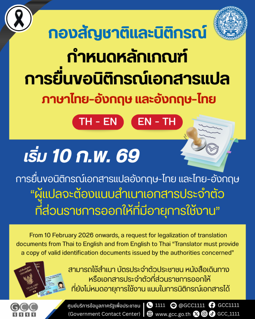 ตั้งแต่วันที่ 10 กุมภาพันธ์ 2569 เป็นต้นไป การยื่นขอนิติกรณ์เอกสารแปลอังกฤษ-ไทย และไทย-อังกฤษ “ผู้แปลจะต้องแนบสำเนาเอกสารประจำตัวที่ส่วนราชการออกให้ที่มีอายุการใช้งาน”