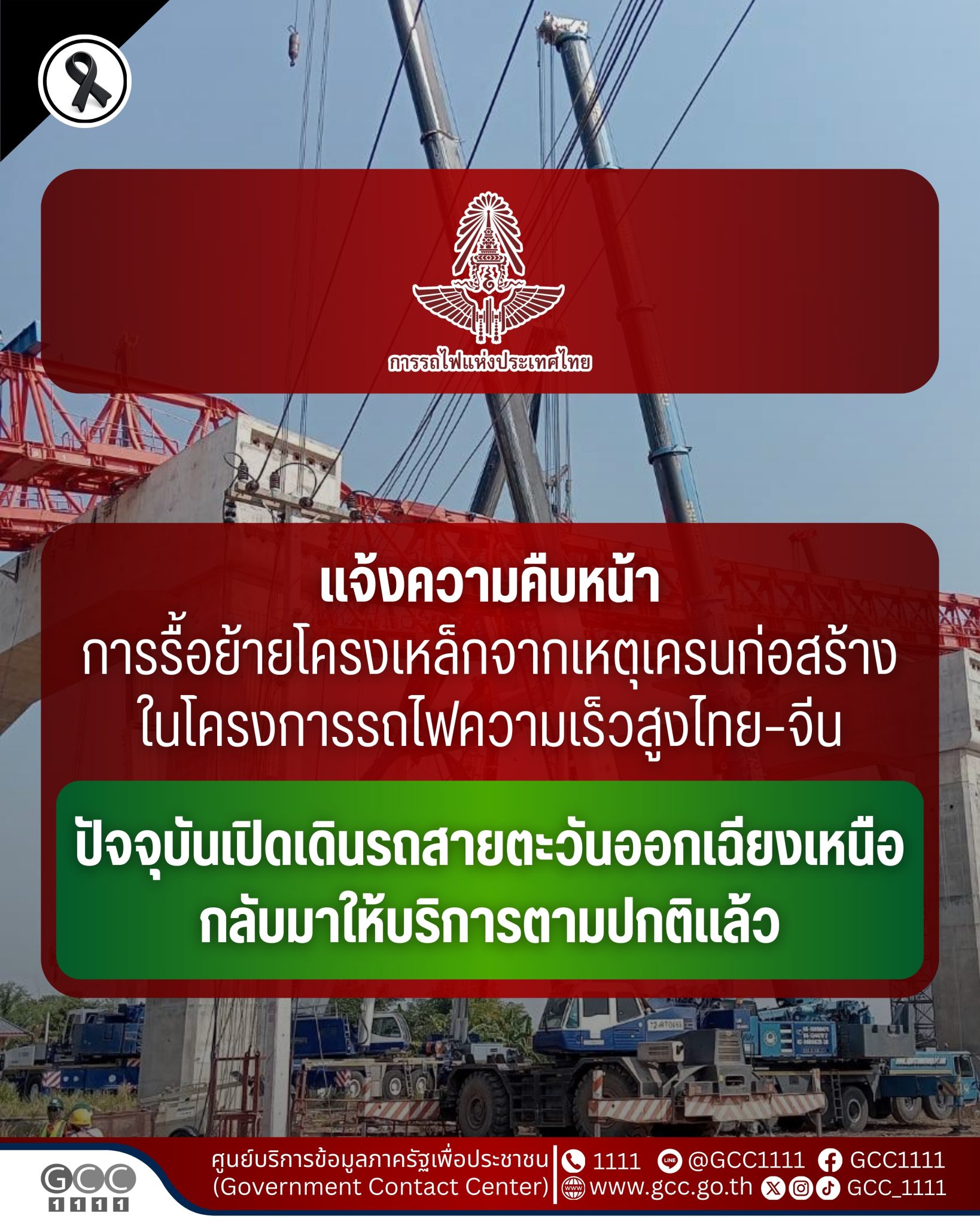 การรถไฟแห่งประเทศไทย เปิดเผยว่าการรื้อย้ายโครงเหล็กจากเหตุเครนก่อสร้างในโครงการรถไฟความเร็วสูงไทย–จีน ได้ดำเนินการแล้วเสร็จเรียบร้อย