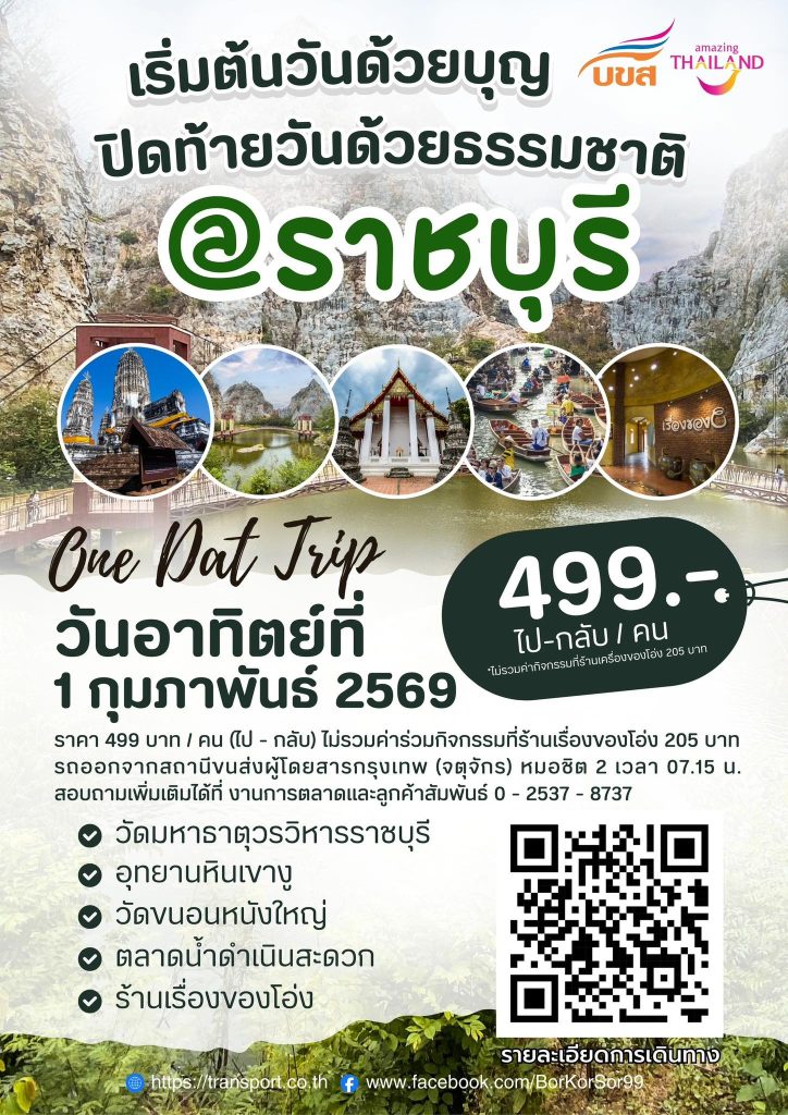 บริษัท ขนส่ง จำกัด ชวนเที่ยวราชบุรี One Day Trip เสริมสิริมงคล อิ่มบุญ อิ่มใจ อิ่มอร่อย ในวันเดียว เดินทางวันอาทิตย์ที่ 1 กุมภาพันธ์ 2569 แบบ One Day Trip