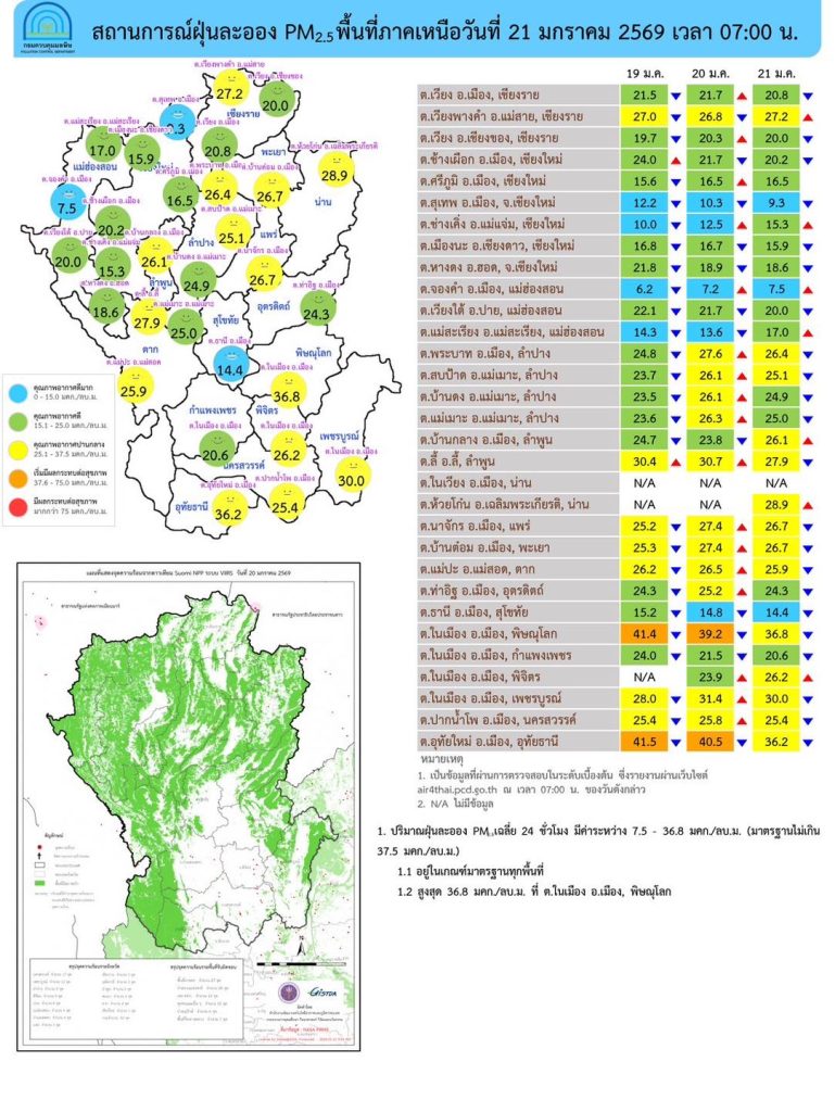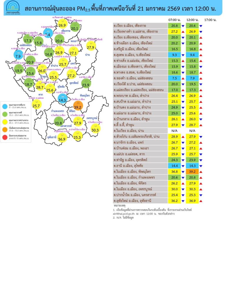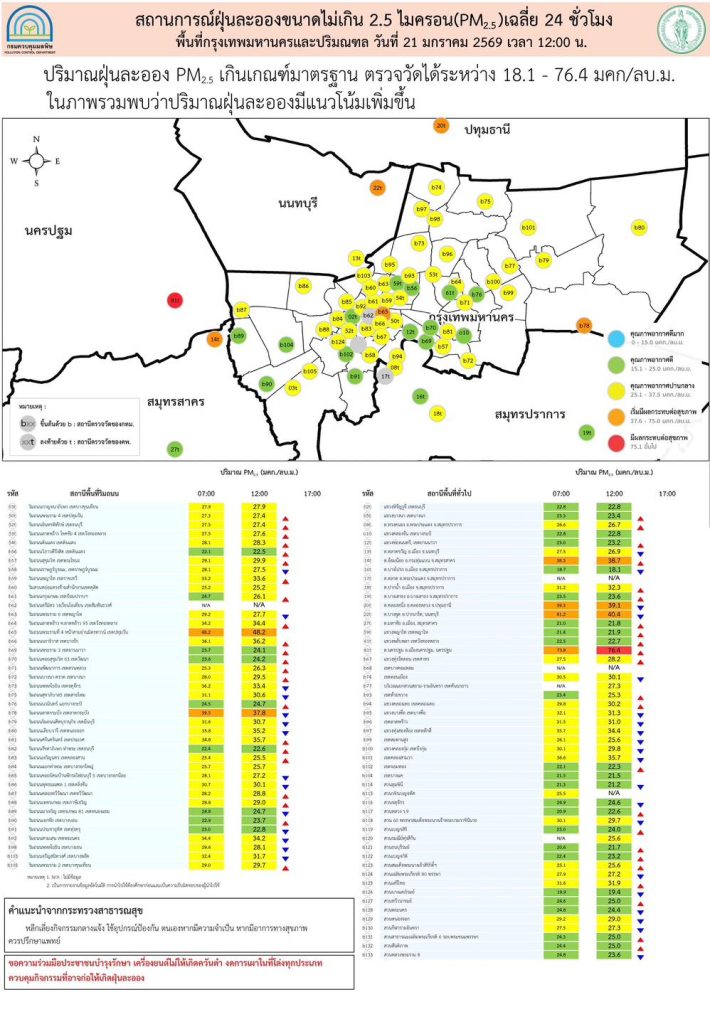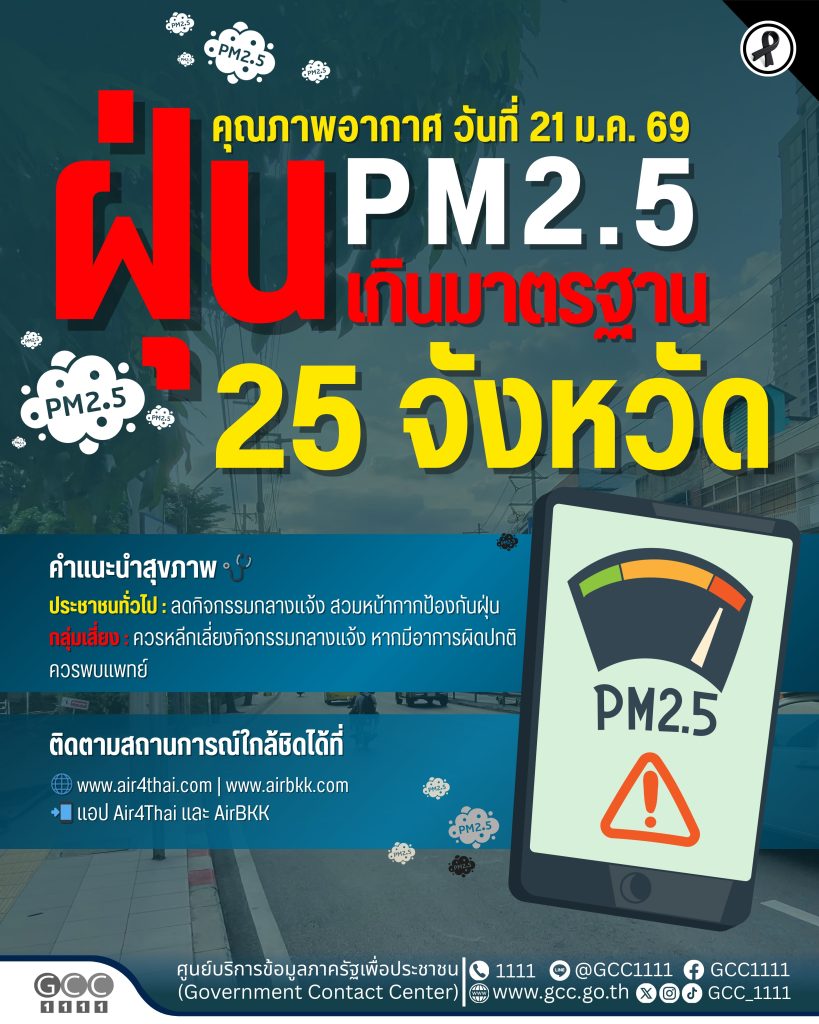 ศกพ. รายงานการติดตามตรวจสอบคุณภาพอากาศ ประจำวันที่ 21 มกราคม 2569 ข่าวสารกิจกรรม, สาธารณภัย ศกพ. รายงานการติดตามตรวจสอบคุณภาพอากาศ ประจำวันที่ 21 มกราคม 2569 ศูนย์สื่อสารการแก้ไขปัญหามลพิษทางอากาศ รายงานการติดตามตรวจสอบคุณภาพอากาศ ประจำวันที่ 21 มกราคม 2569 เวลา 12.00 น สรุปดังนี้ภาพรวมปริมาณ PM2.5 ในประเทศพบเกินค่ามาตรฐานใน 22 จังหวัดจ.ปทุมธานี จ.นนทบุรี จ.นครปฐม กรุงเทพฯ จ.สมุทรสาคร จ.พิษณุโลก จ.สิงห์บุรี จ.ลพบุรี จ.สระบุรี จ.อ่างทอง จ.สุพรรณบุรี จ.พระนครศรีอยุธยา จ.กาญจนบุรี จ.ราชบุรี จ.ปราจีนบุรี จ.สระแก้ว จ.ชลบุรี จ.หนองคาย จ.ขอนแก่น จ.ชัยภูมิ จ.นครราชสีมา และ จ.สุรินทร์ภาคเหนือ เกินค่ามาตรฐาน 1 พื้นที่ ตรวจวัดได้ 7.9 – 39.2 ไมโครกรัมต่อลูกบาศก์เมตรภาคตะวันออกเฉียงเหนือ เกินค่ามาตรฐาน 5 พื้นที่ ตรวจวัดได้ 18.5 – 65.4 ไมโครกรัมต่อลูกบาศก์เมตรภาคกลางและตะวันตก เกินค่ามาตรฐานเป็นส่วนใหญ่ ตรวจวัดได้ 17.7 – 65.7 ไมโครกรัมต่อลูกบาศก์เมตรภาคตะวันออก เกินค่ามาตรฐาน 3 พื้นที่ ตรวจวัดได้ 15.1 – 49.0 ไมโครกรัมต่อลูกบาศก์เมตรภาคใต้ ภาพรวมอยู่ในเกณฑ์ดี ตรวจวัดได้ 13.1 – 21.2 ไมโครกรัมต่อลูกบาศก์เมตรกรุงเทพมหานครและปริมณฑล เกินค่ามาตรฐาน 6 พื้นที่ ตรวจวัดได้ 18.1 – 76.4 ไมโครกรัมต่อลูกบาศก์เมตรคำแนะนำทางสุขภาพประชาชนทั่วไป : ควรเฝ้าระวังสุขภาพ ลดเวลาการทำกิจกรรมกลางแจ้ง หรือใช้อุปกรณ์ป้องกันตนเองผู้ที่ต้องดูแลสุขภาพเป็นพิเศษ : ควรลดระยะเวลาการทำกิจกรรมกลางแจ้ง หรือใช้อุปกรณ์ป้องกันตนเอง ถ้ามีอาการทางสุขภาพ ควรปรึกษาแพทย์ สามารถติดตามสถานการณ์ผ่านทางเว็บไซต์ Air4Thai.com และ airbkk.com แอปพลิเคชัน Air4Thai และ AirBKK ที่มา : Facebook ศูนย์สื่อสารการแก้ไขปัญหามลพิษทางอากาศ Post Views: 10 FacebookFacebookXTwitterLINELine