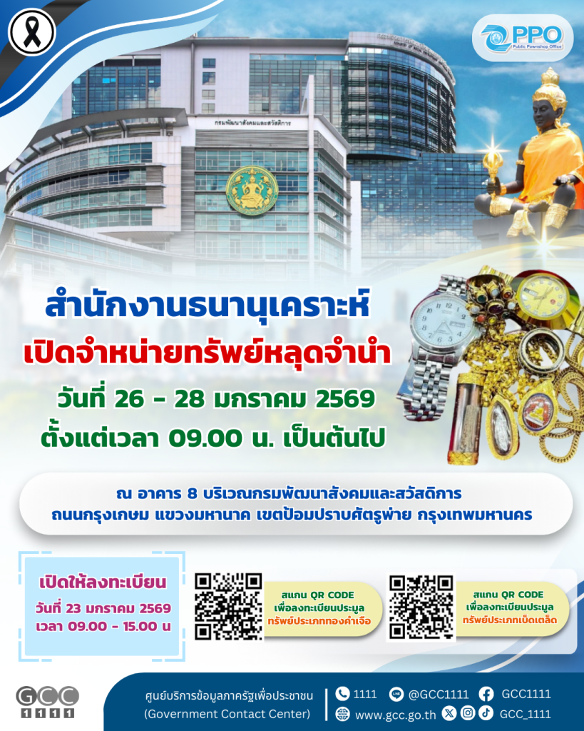 - สำนักงานธนานุเคราะห์ จัดงานประมูลทรัพย์หลุดจำนำ ทองรูปพรรณ เพชรรูปพรรณ ทองคำเจือ นาก เงินรูปพรรณ เครื่องใช้ไฟฟ้า และสินค้าเบ็ดเตล็ดอื่นๆ ในวันที่ 26 – 28 มกราคม 2569 ตั้งแต่เวลา 09.00 น. เป็นต้นไป