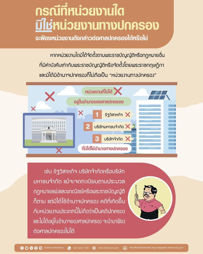 สำนักงานศาลปกครอง แนะนำรอบรู้เรื่องศาลปกครองตอน กรณีที่หน่วยงานใด มิใช่ หน่วยงานทางปกครอง ข่าวสารกิจกรรม สำนักงานศาลปกครอง แนะนำรอบรู้เรื่องศาลปกครองตอน กรณีที่หน่วยงานใด มิใช่ หน่วยงานทางปกครอง รอบรู้เรื่องศาลปกครองไปกับลุงเป็นธรรม ตอน กรณีที่หน่วยงานใด มิใช่ หน่วยงานทางปกครอง จะฟ้องหน่วยงานดังกล่าวต่อศาลปกครองได้หรือไม่ หากหน่วยงานใดมิได้จัดตั้งตามพระราชบัญญัติหรือกฎหมายอื่น ที่มีค่าบังคับเท่ากับพระราชบัญญัติหรือจัดตั้งโดยพระราชกฤษฎีกา และมิได้มีอำนาจปกครองก็ไม่ถือเป็น “หน่วยงานทางปกครอง”หน่วยงานที่ไม่ได้ อยู่ในอำนาจของศาลปกครองรัฐวิสาหกิจบริษัทมหาชนจํากัดบริษัทจํากัด ที่มิได้ใช้อำนาจทางปกครอง เช่น รัฐวิสาหกิจ บริษัทจํากัดหรือบริษัท มหาชนจํากัด แม้จะจดทะเบียนตามประมวล กฎหมายแพ่งและพาณิชย์หรือพระราชบัญญัติ ก็ตาม แต่มิได้ใช้อำนาจปกครอง คดีที่เกิดขึ้น กับหน่วยงานประเภทนี้ไม่ถือว่าเป็นคดีปกครอง และไม่ได้อยู่ในอำนาจของศาลปกครอง จะนำมาฟ้อง ต่อศาลปกครองไม่ได้สอบถามข้อมูลหรือปรึกษาข้อกฎหมายเกี่ยวกับคดีปกครองได้ที่สายด่วนศาลปกครอง 1355 (ในวันและเวลาราชการ) ที่มา : Facebook : สำนักงานศาลปกครอง Post Views: 7 FacebookFacebookXTwitterLINELine