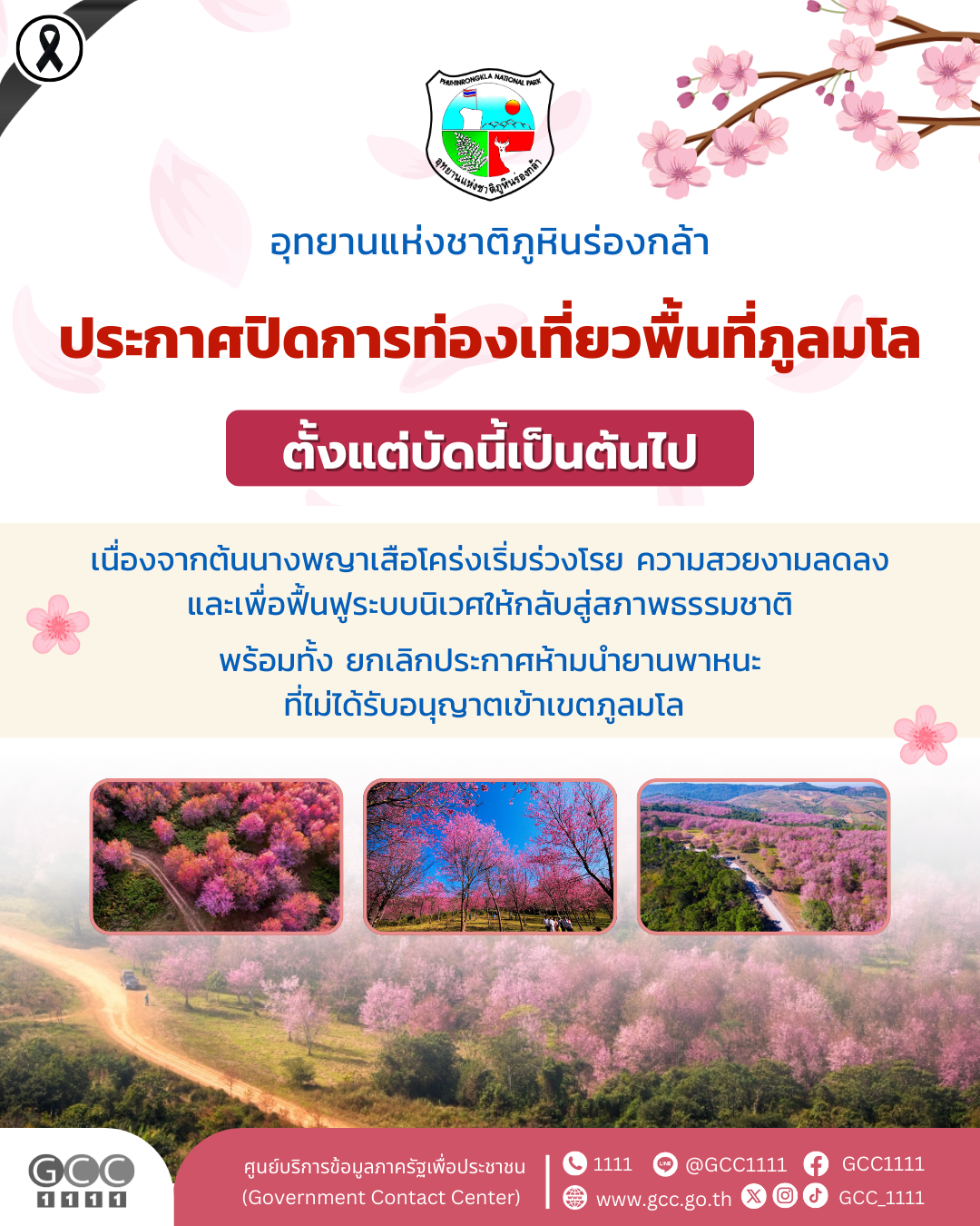 เนื่องด้วย สถานการณ์ปัจจุบันต้นนางพญาเสือโคร่ง (ชากุระเมืองไทย) เริ่มผลิใบและดอกร่วงโรย เป็นจำนวนมาก ทำให้ความสวยงามของต้นนางพญาเสือโคร่ง (ซากุระเมืองไทย) ลดน้อยลงและหมดไป ไม่มีความจำเป็นที่จะให้รถนำเที่ยวพานักท่องเที่ยวเข้าไปในพื้นที่อีกต่อไป ประกอบกับต้องทำการปรับปรุง ฟื้นฟูระบบนิเวศบริเวณพื้นที่ภูลมโลให้กลับคืนสู่สภาพป่าธรรมชาติที่สมบูรณ์ดังเดิม