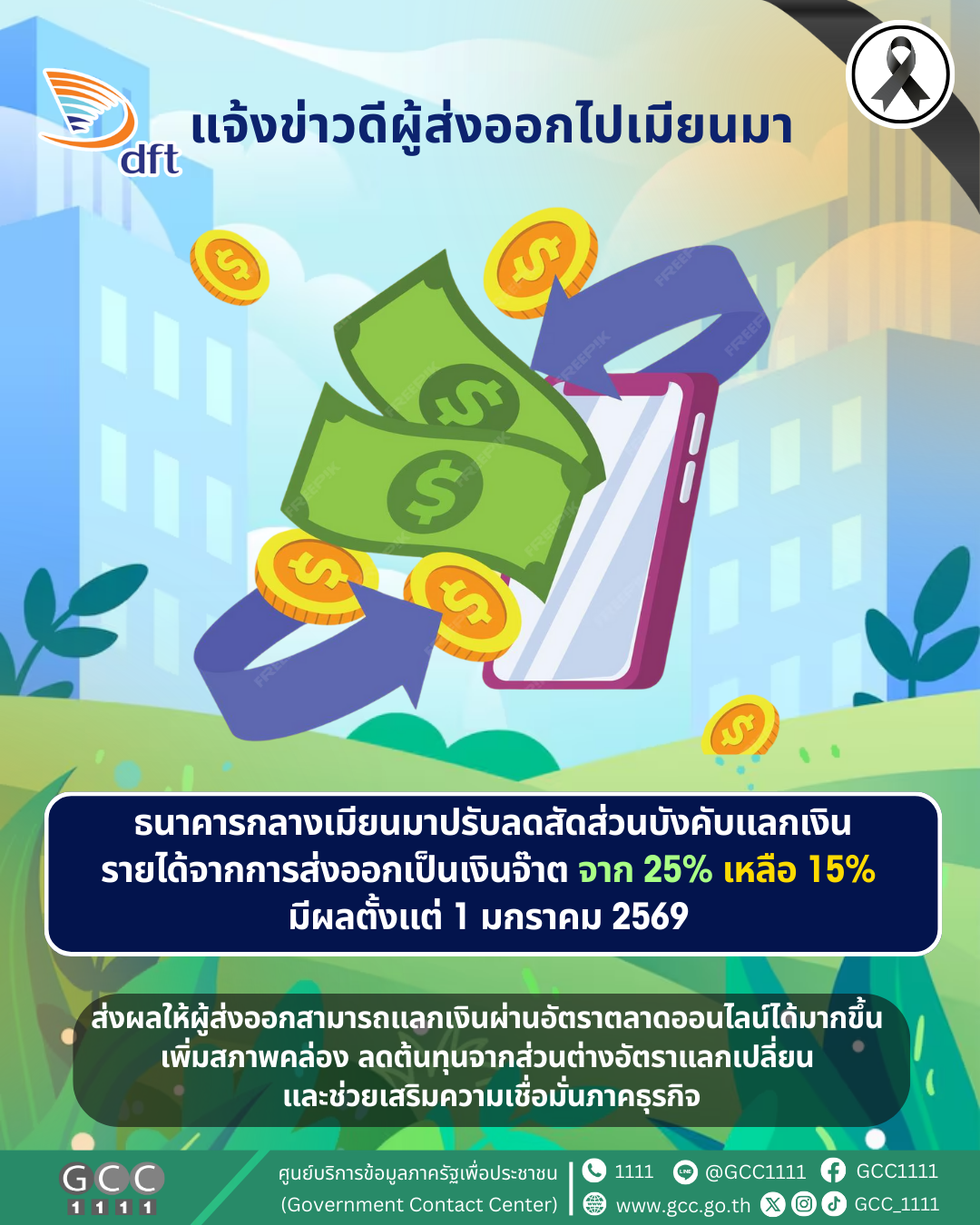 คต. แจ้งข่าวดีผู้ส่งออกไปเมียนมา ธนาคารกลางเมียนมาลดสัดส่วนแลกเงินส่งออกเป็นจ๊าต เหลือ 15% มีผล 1 ม.ค. 2569 หนุนสภาพคล่องภาคธุรกิจ