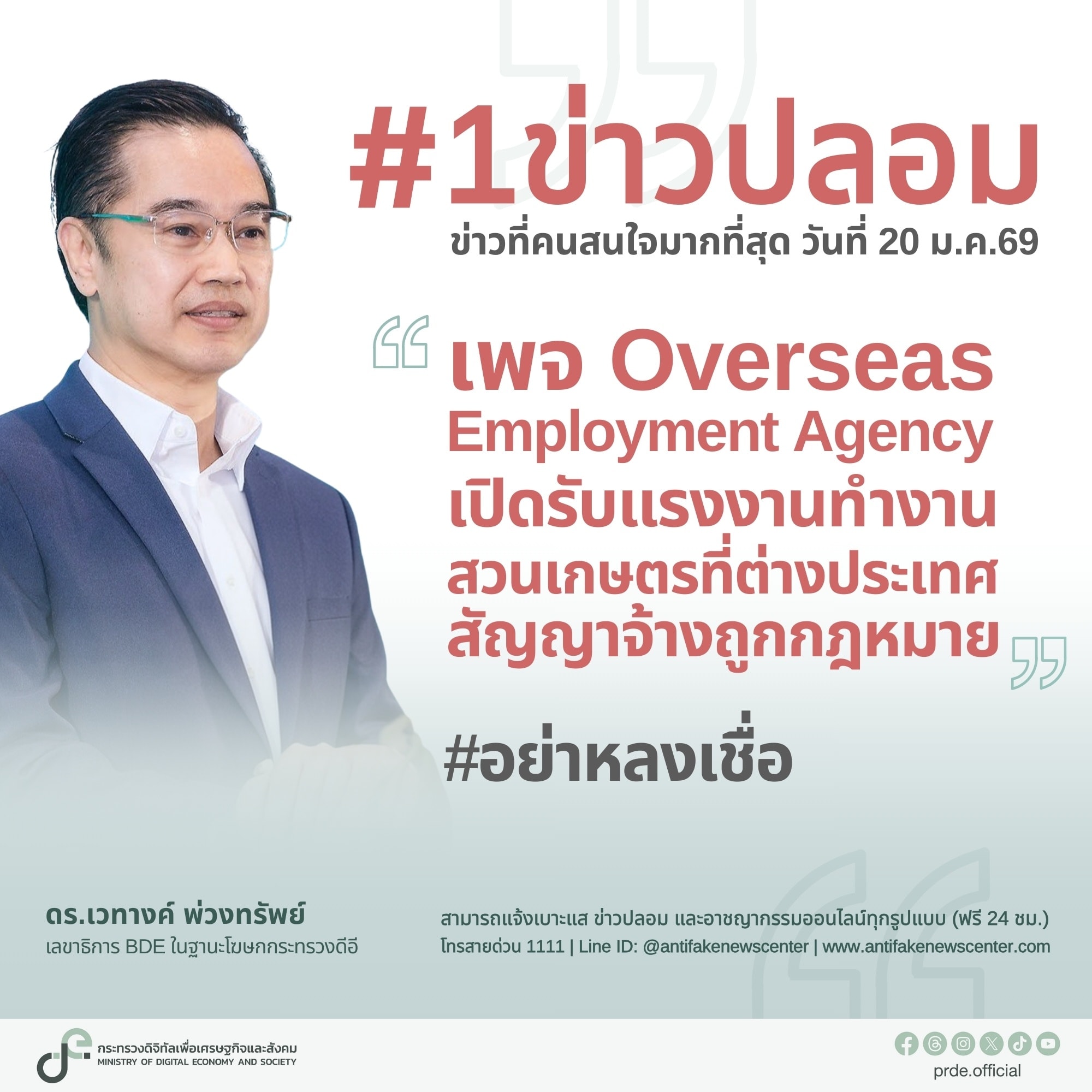 สำหรับอันดับ 1 เป็นข่าวปลอม : เรื่อง “เพจ Overseas Employment Agency เปิดรับแรงงานไปทำงานสวนเกษตรที่ต่างประเทศ มีสัญญาจ้างงานถูกกฎหมาย” กระทรวงดีอี ได้ประสานงานร่วมกับ กรมการจัดหางาน กระทรวงแรงงาน ยืนยันเป็น “ข่าวปลอม” โดยบัญชีเฟซบุ๊กดังกล่าวเป็นของมิจฉาชีพ และบริษัทตามที่กล่าวอ้างเปิดรับสมัครแรงงานข้างต้นไม่ได้เป็นบริษัทจัดหางานที่ได้รับอนุญาตจากกรมการจัดหางานแต่อย่างใด และการโฆษณาจัดหาแรงงานไปต่างประเทศจะกระทำได้เฉพาะผู้ที่มีใบอนุญาตเท่านั้น