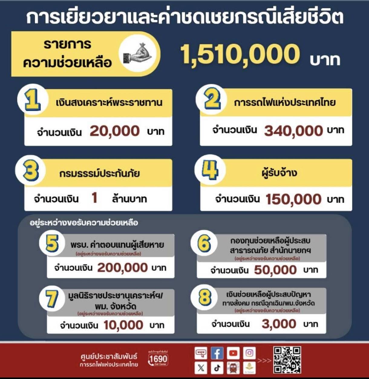 - รฟท. ได้ดำเนินการประสานงานพิสูจน์เอกลักษณ์บุคคลเสร็จสิ้นครบทั้ง 30 ราย และได้จัดส่งผู้แทนระดับบริหารเข้าร่วมพิธีสวดพระอภิธรรมและพิธีพระราชทานเพลิงศพทุกราย โดยมีการมอบเงินเยียวยาเบื้องต้นรวม 1,510,000 บาทต่อราย จากแหล่งเงินหลักได้แก่