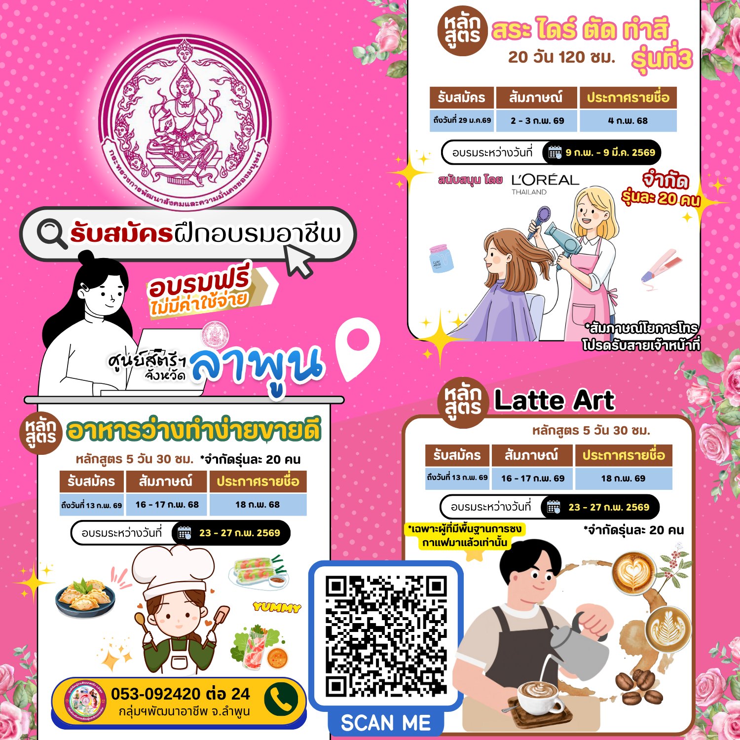 ศูนย์เรียนรู้การพัฒนาสตรีฯ ลำพูน เปิดรับสมัครผู้เข้าฝึกอบรมอาชีพ ประจำเดือนกุมภาพันธ์ 2569