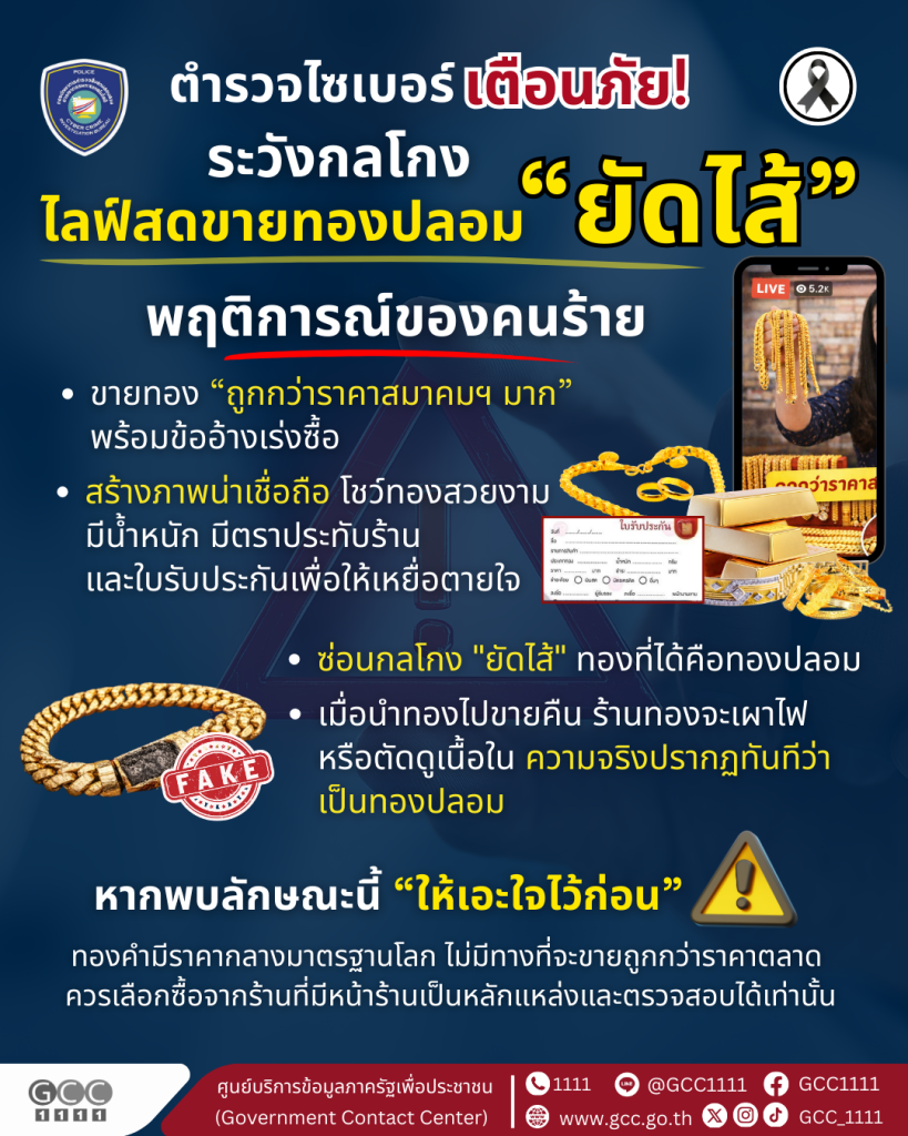 ตำรวจไซเบอร์ เตือนภัย กลโกง ไลฟ์สดขายทองปลอมยัดไส้