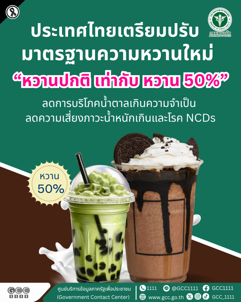 กรมอนามัย เตรียมการปรับมาตรฐานความหวานของเครื่องดื่มชงในประเทศไทย ภายใต้แนวคิด “หวานปกติ เท่ากับ หวาน 50%” อย่างเป็นรูปธรรม เพื่อปรับเปลี่ยนพฤติกรรมการบริโภคของประชาชน ลดการบริโภคน้ำตาลเกินความจำเป็น ลดความเสี่ยงภาวะน้ำหนักเกินและโรค NCDs และส่งเสริมสุขภาพที่ดีของคนไทยอย่างยั่งยืน พร้อมเปิดตัวแคมเปญ “หวานปกติ เท่ากับ หวาน 50%”อย่างเป็นทางการในวันที่ 11 กุมภาพันธ์ 2569 ซึ่งคาดว่าจะเป็นจุดเริ่มต้นของการขับเคลื่อนนโยบายด้านโภชนาการที่สำคัญในระดับประเทศ