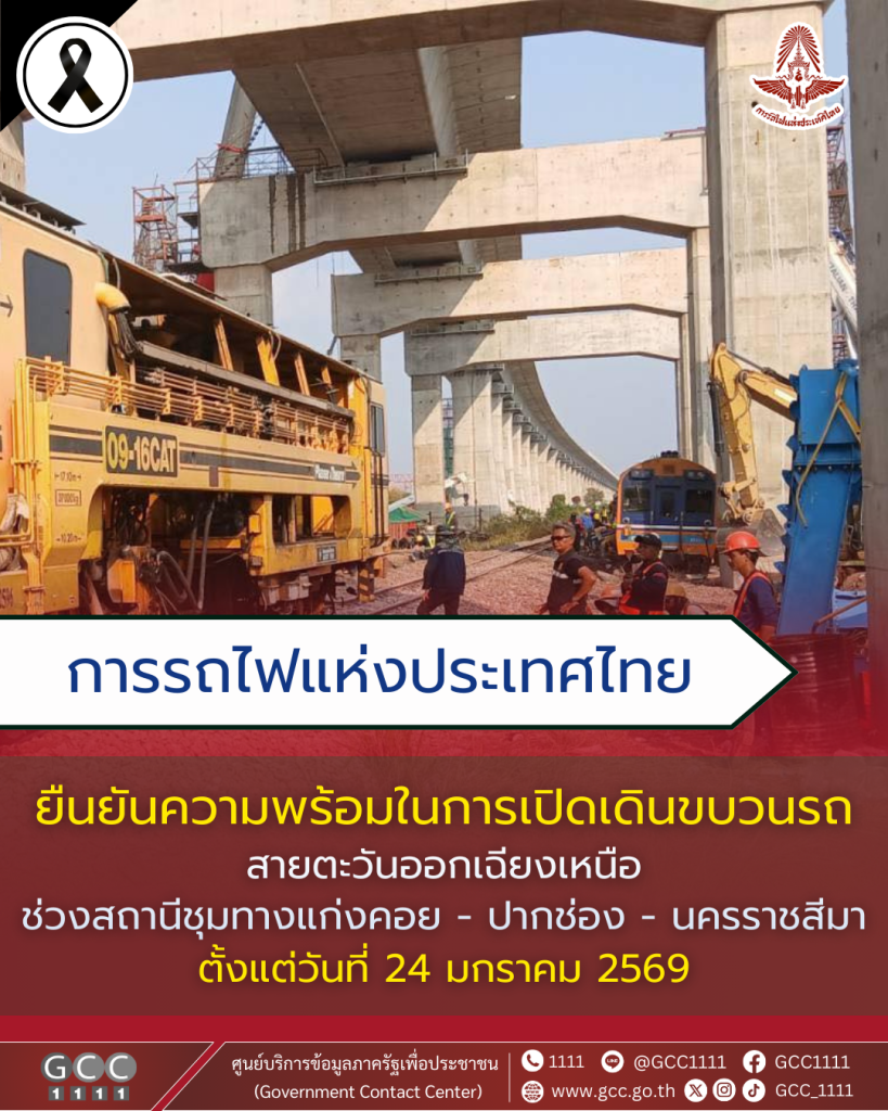 การรถไฟแห่งประเทศไทย (รฟท.) แจ้งความพร้อมในการเปิดเดินขบวนรถสายตะวันออกเฉียงเหนือ ช่วงสถานีชุมทางแก่งคอย – ปากช่อง – นครราชสีมา ตั้งแต่วันที่ 24 มกราคม 2569 ภายหลังจากการดำเนินการตรวจสอบและรับรองด้านความปลอดภัยอย่างรอบคอบ เพื่อสร้างความมั่นใจแก่ประชาชนผู้ใช้บริการ