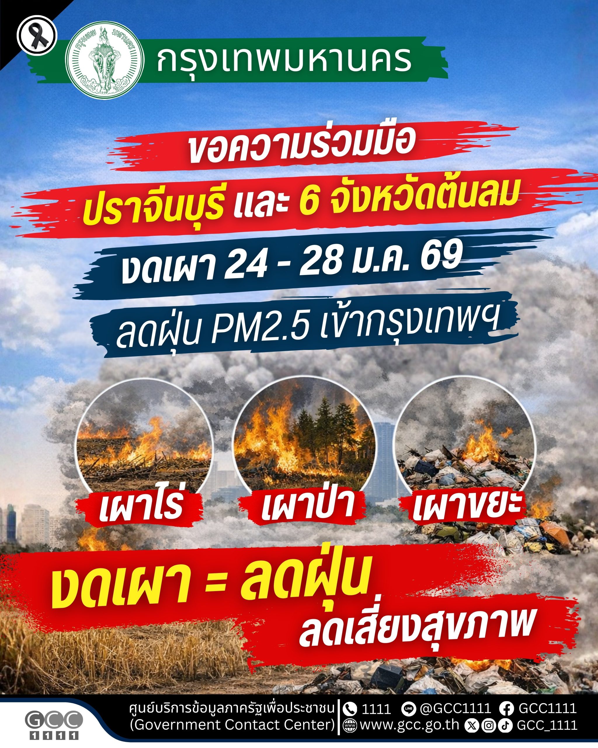 กทม. ขอความร่วมมือปราจีนบุรี และ 6 จังหวัดต้นลม งดเผา 24 – 28 ม.ค. 69 ลดฝุ่น PM2.5 เข้ากรุงเทพฯ
